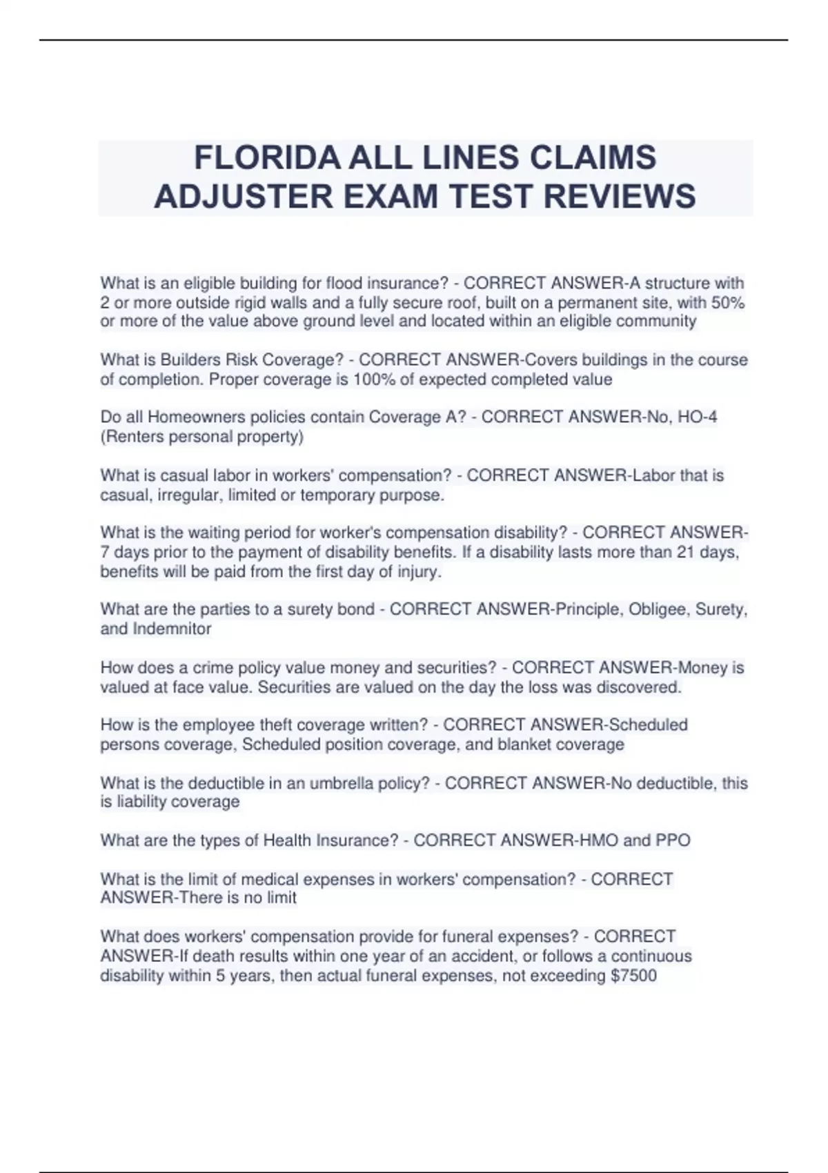 FLORIDA ALL LINES CLAIMS ADJUSTER EXAM TEST REVIEWS What is an eligible building for flood insurance? - CORRECT ANSWER-A structure with 2 or more outside rigid walls and a fully secure roof, built on a permanent site, with 50% or more of the value above ground level and located within an eligible community What is Builders Risk Coverage? - CORRECT ANSWER-Covers buildings in the course of completion. Proper coverage is 100% of expected completed value Do all Homeowners policies contain Coverage A? - CORRECT ANSWER-No, HO-4 (Renters personal property) What is casual labor in workers' compensation? - CORRECT ANSWER-Labor that is casual, irregular, limited or temporary purpose. What is the waiting period for worker's compensation disability? - CORRECT ANSWER7 days prior to the payment of disability benefits. If a disability lasts more than 21 days, benefits will be paid from the first day of injury. What are the parties to a surety bond - CORRECT ANSWER-Principle, Obligee, Surety, and Indemnitor How does a crime policy value money and securities? - CORRECT ANSWER-Money is valued at face value. Securities are valued on the day the loss was discovered. How is the employee theft coverage written? - CORRECT ANSWER-Scheduled persons coverage, Scheduled position coverage, and blanket coverage What is the deductible in an umbrella policy? - CORRECT ANSWER-No deductible, this is liability coverage What are the types of Health Insurance? - CORRECT ANSWER-HMO and PPO What is the limit of medical expenses in workers' compensation? - CORRECT ANSWER-There is no limit What does workers' compensation provide for funeral expenses? - CORRECT ANSWER-If death results within one year of an accident, or follows a continuous disability within 5 years, then actual funeral expenses, not exceeding $7500 What is Ocean Marine coverage? - CORRECT ANSWER-Oldest form of insurance known. Covers perils associated with water transport. What is Inland Marine Coverage? - CORRECT ANSWER-Covers the cargo traveling overland, instead of by sea. What is "all risk" coverage in a homeowners policy? - CORRECT ANSWER-Property insurance covering loss arising from any fortuitous cause except those specifically excluded If you know how much Coverage A is in a Homeowners' policy, do you know how much Coverage B and C would be? - CORRECT ANSWER-Coverage B is automatically 10% of A and Coverage C is normally 50% of A. When is PIP available to the insured? - CORRECT ANSWER-PIP is available to an insured while occupying a motor vehicle or while injured as a pedestrian in the state of FL How does PIP deductible work? - CORRECT ANSWER-If an insured selects a deductible than that amount is always taken off the loss, even if its more than the PIP limit. What does occupying mean in regard to auto? - CORRECT ANSWER-means in, upon, getting in, on, out, or off of a vehicle In which coverage is the insurance company's promise to defend the insured? - CORRECT ANSWER-Liability Coverage What is excluded from auto liability coverage? - CORRECT ANSWER-intentional injury or damage, property owned or being transported by the insured, injuries to an employee while on the job, using a vehicle without the reasonable belief of permission. vehicle with less than 4 wheels Bodily Injury - CORRECT ANSWER-means physical harm and includes sickness, disease or death resulting from that physical harm. What vehicles are covered by a auto liability insurance? - CORRECT ANSWERRestricted to 4-wheel private passenger vehicles that are owned by the insured. What does the Miscellaneous Type Vehicle endorsement cover? - CORRECT ANSWER-covers equipment such as motor-homes, motorcycles, golf carts and all