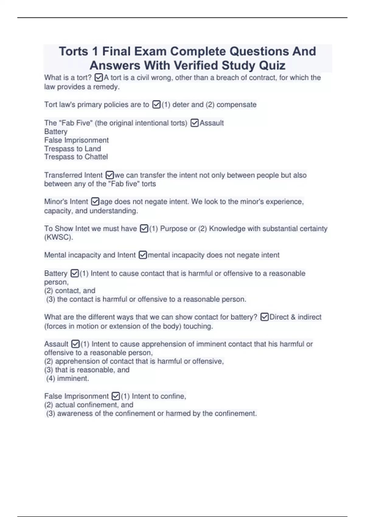 Torts 1 Final Exam Complete Questions And Answers With Verified Study Quiz Torts 1 Final Exam Complete Questions And Answers With Verified Study Quiz