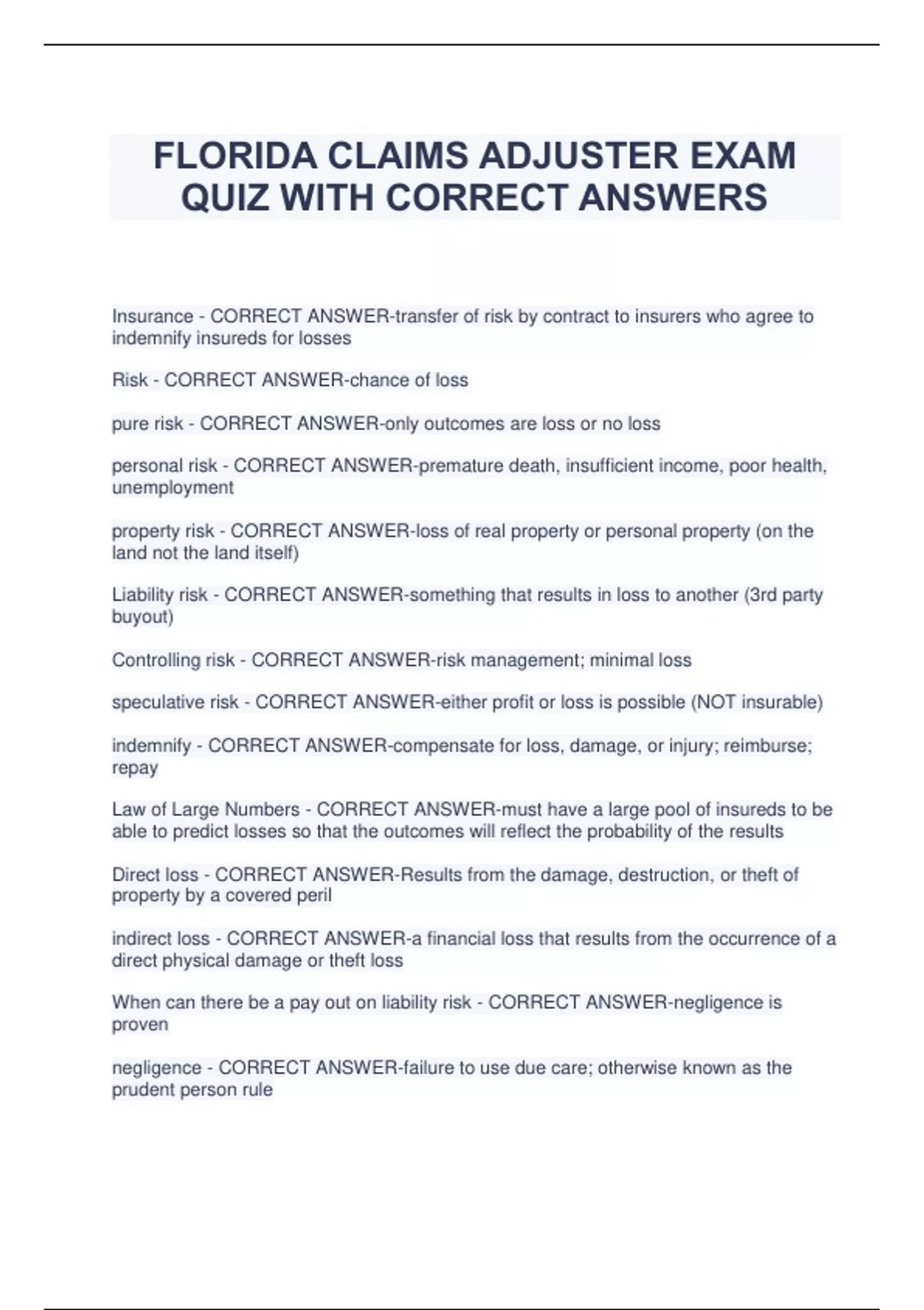 FLORIDA CLAIMS ADJUSTER EXAM QUIZ WITH CORRECT ANSWERS Insurance - CORRECT ANSWER-transfer of risk by contract to insurers who agree to indemnify insureds for losses Risk - CORRECT ANSWER-chance of loss pure risk - CORRECT ANSWER-only outcomes are loss or no loss personal risk - CORRECT ANSWER-premature death, insufficient income, poor health, unemployment property risk - CORRECT ANSWER-loss of real property or personal property (on the land not the land itself) Liability risk - CORRECT ANSWER-something that results in loss to another (3rd party buyout) Controlling risk - CORRECT ANSWER-risk management; minimal loss speculative risk - CORRECT ANSWER-either profit or loss is possible (NOT insurable) indemnify - CORRECT ANSWER-compensate for loss, damage, or injury; reimburse; repay Law of Large Numbers - CORRECT ANSWER-must have a large pool of insureds to be able to predict losses so that the outcomes will reflect the probability of the results Direct loss - CORRECT ANSWER-Results from the damage, destruction, or theft of property by a covered peril indirect loss - CORRECT ANSWER-a financial loss that results from the occurrence of a direct physical damage or theft loss When can there be a pay out on liability risk - CORRECT ANSWER-negligence is proven negligence - CORRECT ANSWER-failure to use due care; otherwise known as the prudent person rule Strict or Absolute Liability - CORRECT ANSWER-Liability assigned by statute without regard for negligence (set by the state or industry, no allowable defense) Indemnity Principle - CORRECT ANSWER-one should be in approximately the same position after a loss as he was before the loss Insurer - CORRECT ANSWER-A person or company that underwrites an insurance risk; the party in an insurance contract undertaking to pay compensation. Insured - CORRECT ANSWER-one who is named or covered by insurance Insurable interest - CORRECT ANSWER-must exist at the time of loss and usually means an economic or other interest in the event or in a particular property ex: bank loans or mortgage companies What is the measure of insurable interest - CORRECT ANSWER-the extent to which the insured might be damnified by loss, injury, or impairment thereof Policy - CORRECT ANSWER-a written document containing coverage, exclusions, conditions and endorsements Binder - CORRECT ANSWER-can be oral or written and places the insurance "in effect" Requirements of a valid contract - CORRECT ANSWER-consent of all parties (offer and acceptance), valuable consideration (monetary exchange), all parties must be of legal capacity (competent), and it must be for legal purposes to be enforceable Characteristics of an insurance contract - CORRECT ANSWER-personal, conditional, contract of adhesion (gray area, will side on the behalf of the insured), principle of indemnity, aleatory (exchange is not equal), unilateral (payment for a promise) Domestic insurance company - CORRECT ANSWER-A company that resides and is incorporated under the laws of the state in which it is operating Foreign Insurance Company - CORRECT ANSWER-An insurance company that is incorporated outside the state where it is conducting business Alien Insurance Company - CORRECT ANSWER-An insurance company incorporated outside the country Peril - CORRECT ANSWER-something that causes a loss ex: Fire, lightening Hazard - CORRECT ANSWER-something that increases the probability a loss will occur or increases the severity Physical hazard - CORRECT ANSWER-A physical characteristic that may increase the likelihood of loss (wet floor, icy roads) Moral hazard - CORRECT ANSWER-a conscious act that may cause a loss to occur (deliberate theft) Morale hazard - CORRECT ANSWER-an unconscious act that may cause a loss to occur (out of your control) Proximate cause - CORRECT ANSWER-if there is an unbroken chain of events from the occurrence and damage from that occurrence, all damage is a result of that occurrence (water damage from a fire) property insurance - CORRECT ANSWER-A type of insurance that covers damage to property, such as a home. Liability/Casualty Insurance - CORRECT ANSWER-Payable to a third party on behalf of the insured (bodily injury to another) assumption of risk - CORRECT ANSWER-A defense against negligence that can be used when the plaintiff was aware of a danger and voluntarily assumed the risk of injury from that danger. Comparative Negligence - CORRECT ANSWER-the apportioning of blame in an accident (both parties are at fault) actual cash value - CORRECT ANSWER-current cost less depreciation replacement cost - CORRECT ANSWER-current cost (no depreciation) valued policy - CORRECT ANSWER-pays the face amount of insurance if a total loss occurs Florida Valued Policy Law applies to - CORRECT ANSWER-total loss of a building, home or manufactured home based on insured value Coinsurance - CORRECT ANSWER-the sharing of expenses by the policyholder and the insurance company ex: a homeowner fails to increase insurance policy after renovations, therefore the DID/Should model is applied and the insurance company only pays out partially on the loss specific insurance - CORRECT ANSWER-When each property is named and specifically covered for a set amount blanket insurance - CORRECT ANSWER-When a single amount of coverage applies to any loss of property or injury up to the single limit amount (one bucket for multiple properties) mortgage clause - CORRECT ANSWER-establishes rights of mortgagee (lender) in the policy. Generally used in fixed property (real estate). Loss Payable Clause - CORRECT ANSWER-Establishes rights of a lender having interest in personal property. Sometimes called loss payee clause Subrogation - CORRECT ANSWER-when insured transfers right to his company to collect damages ex: collecting funds from an at fault driver's insurance company severability - CORRECT ANSWER-Insurance applies separately to each insured as if other insureds did not exist. (usually applies to spouses) liberalization - CORRECT ANSWER-used when 