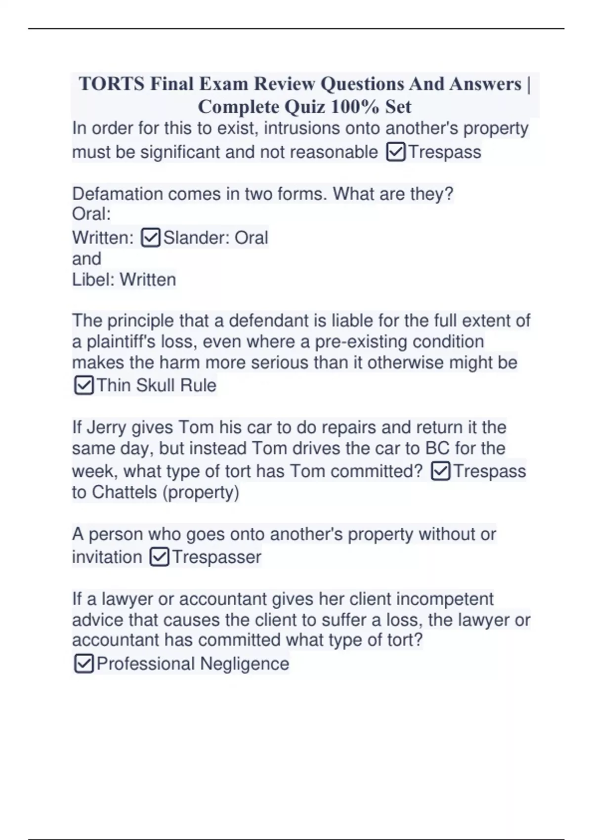 TORTS Final Exam Review Questions And Answers | Complete Quiz 100% Set TORTS Final Exam Review Questions And Answers | Complete Quiz 100% Set