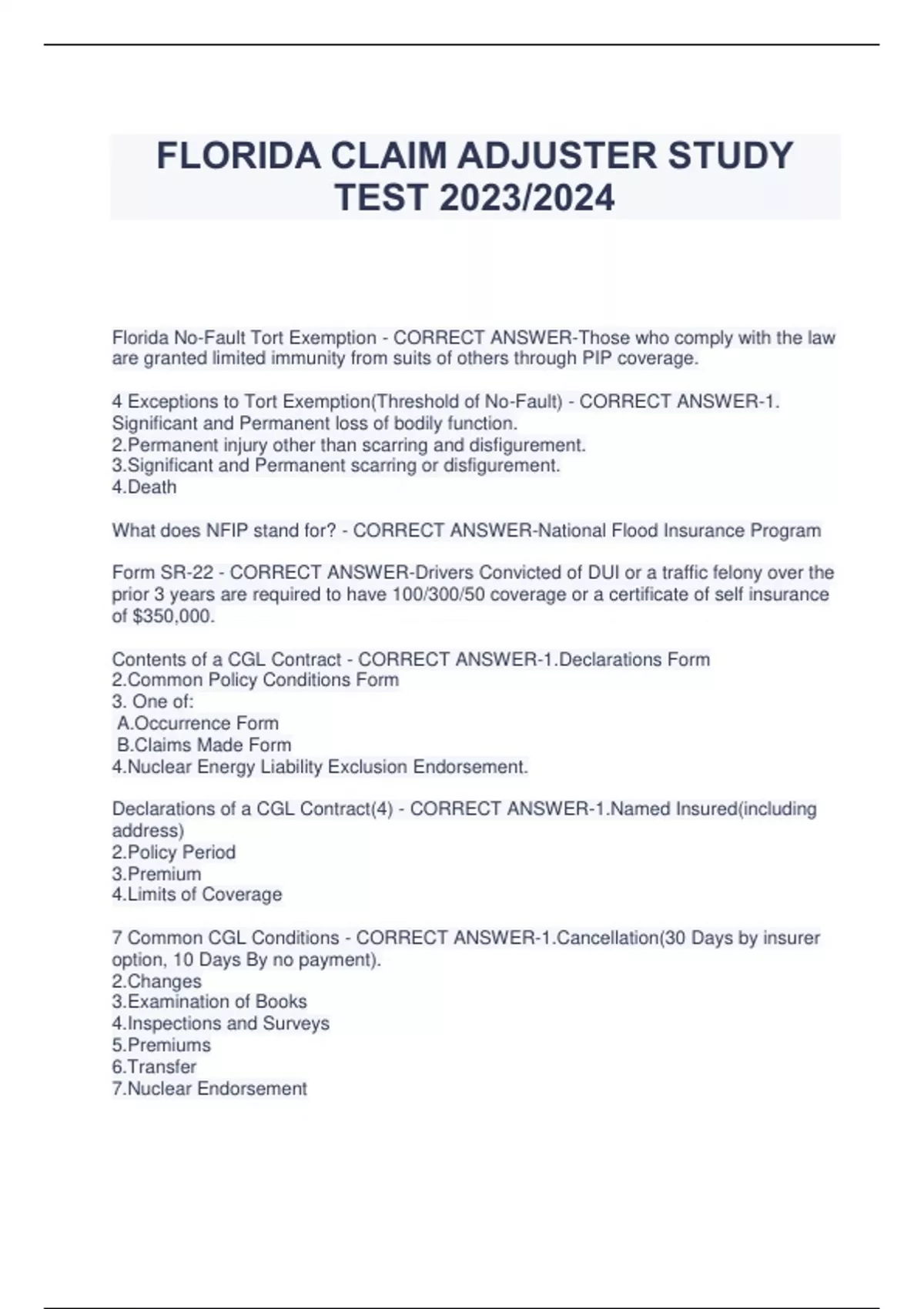 FLORIDA CLAIM ADJUSTER STUDY TEST 2023/2024 Florida No-Fault Tort Exemption - CORRECT ANSWER-Those who comply with the law are granted limited immunity from suits of others through PIP coverage. 4 Exceptions to Tort Exemption(Threshold of No-Fault) - CORRECT ANSWER-1. Significant and Permanent loss of bodily function. 2.Permanent injury other than scarring and disfigurement. 3.Significant and Permanent scarring or disfigurement. 4.Death What does NFIP stand for? - CORRECT ANSWER-National Flood Insurance Program Form SR-22 - CORRECT ANSWER-Drivers Convicted of DUI or a traffic felony over the prior 3 years are required to have 100/300/50 coverage or a certificate of self insurance of $350,000. Contents of a CGL Contract - CORRECT ANSWER-1.Declarations Form 2.Common Policy Conditions Form 3. One of: A.Occurrence Form B.Claims Made Form 4.Nuclear Energy Liability Exclusion Endorsement. Declarations of a CGL Contract(4) - CORRECT ANSWER-1.Named Insured(including address) 2.Policy Period 3.Premium 4.Limits of Coverage 7 Common CGL Conditions - CORRECT ANSWER-1.Cancellation(30 Days by insurer option, 10 Days By no payment). 2.Changes 3.Examination of Books 4.Inspections and Surveys 5.Premiums 6.Transfer 7.Nuclear Endorsement CGL Coverage A - CORRECT ANSWER-Bodily Injury and Property Damage Insuring Agreement The 3 Conditions that define work as "completed" - CORRECT ANSWER-1.When all work called for in the contract is completed. 2.When all work to be done at the site has been completed if one contract calls for work at more than one site. 3.When that part of the work done at a job site has been put to its intended use by any person or organization other than another contractor or subcontractor. Occurance - CORRECT ANSWER-An accident, including continuous or repeated exposure to substantially the same general harmful conditions. accident - CORRECT ANSWER-Sudden, unexpected event The Difference between "Occurance" and "Claims Made" CGL Coverages - CORRECT ANSWER-The Coverage Trigger: The Occurance Form applies to BI and PD regardless of any later time at which the claim is made. The Claims-Made Form applies only to BI and PD that occurs on or after the "RetroActive date" Retro-Active Date - CORRECT ANSWER-The date on which the coverage legally began. Basic Extended Reporting Period for CGL - CORRECT ANSWER-60 Days after expiration Why is the term "Coverage Trigger" misleading? - CORRECT ANSWER-Because it intends to refer to the time period during which the insurance contract is in effect. Umbrella - CORRECT ANSWER-Covers Excessive Liability A Homeowners Policy consists of(3 components): - CORRECT ANSWER1.Declarations 2.One of 6 Homeowners forms 3.Mandatory and optional endorsements If a unit is co-owned, May one co-owner be insured as the renter(HO-4)? - CORRECT ANSWER-Yes What are the two main divisions of a Home Owners Form? - CORRECT ANSWERSection I-Property & Section II-Liability 4 Subsections of Section I of a Property Coverage Policy - CORRECT ANSWER-1. Coverages 2.Perils Insured Against 3.Exclusions 4.Conditions Who determines how much HO-6 coverages a Condominium Owner needs? - CORRECT ANSWER-The Association Homeowners Coverage A - CORRECT ANSWER-"Dwelling" covers the dwelling building and structures attached; also construction materials and supplies on or adjacent to the premises. Homeowners Coverage B - CORRECT ANSWER-"Other Structures" covers private structures on the residence premises that are not attached to the main dwelling. 4 Examples of "Other Structures" Per Coverage B of a Homeowner's policy(book gives 5) - CORRECT ANSWER-1.Detached Garage. 2.Guest House. 3.Fence 4.Tennis Court 5.Storage Building Homeowner's Coverage C - CORRECT ANSWER-"Personal Property" covers Property, wherever it is located, that is owned or used by "an Insured". Homeowners Coverage D - CORRECT ANSWER-"Loss of Use" covers increases over normal living costs if damage from a covered Peril makes the residence unfit for occupancy. What is the standard limit for Homeowners Coverage B? - CORRECT ANSWER-10% of the amount Insured for Coverage A and may not be increased or decreased. What is the standard amount for Coverage C - CORRECT ANSWER-50% of Coverage A. What is the standard limit of Homeowner's Coverage D for: HO-2, HO-3 & HO-5? - CORRECT ANSWER-30% Coverage A How many Perils are listed as "General Exclusions" in your textbook? - CORRECT ANSWER-9 What is the most important Condition that has direct impact on Homeowners Coverage? - CORRECT ANSWER-Loss Settlement When might "Loss Settlement" cover buildings under Coverages A & B to Full Replacement Cost? - CORRECT ANSWER-If the limit of Insurance at the time of Loss is equal to 80% or more of the replacement value of the building. Statute that requires that when Property is Insured for replacement cost is deemed a total loss, the full replacement cost without reservation or holdback of depreciation must be paid. - CORRECT ANSWER-627.7011 627.7011 - CORRECT ANSWER-Statute that requires that when Property Insured for replacement cost is deemed a total loss, the full replacement cost without reservation or holdback of depreciation must be paid. Four Additional Homeowners Coverages - CORRECT ANSWER-1. Claims Expense 2. First Aid Expenses 3. Damage to Property of Others 4. Loss Assessment Does Hurricane Coverage Occur on a Per Occurrence or an Annual Basis - CORRECT ANSWER-An annual basis What if there is more than one applicable deductible? - CORRECT ANSWER-Only the highest deductible applies. What must the Insured do if they wish to completely reject Windstorm Coverage? - CORRECT ANSWER-Hand write "I DO NOT WANT THE INSURANCE ON MY (HOME/MOBILE HOME/CONDOMINIUM UNIT) TO PAY FOR DAMAGE FROM WINDSTORMS OR HURRICANES. I WILL PAY THOSE COSTS. MY INSURANCE WILL NOT." How much notice must the insurer give the insured of non-renewal of a homeowner's Policy? - CORRECT ANSWER-120 Days 4 Elements of a Valid Contract? - CORRECT ANSWER-1.A manifestation of assent to its te