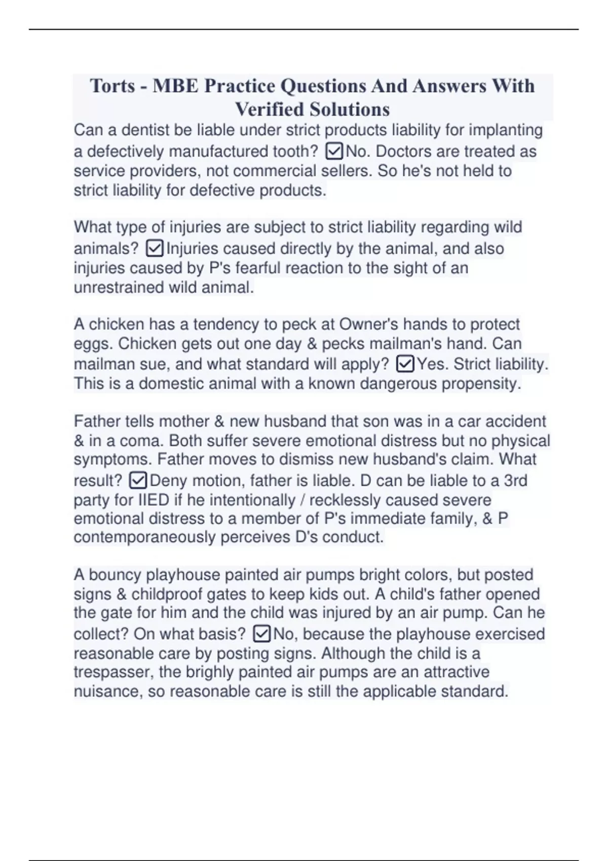 Torts - MBE Practice Questions And Answers With Verified Solutions