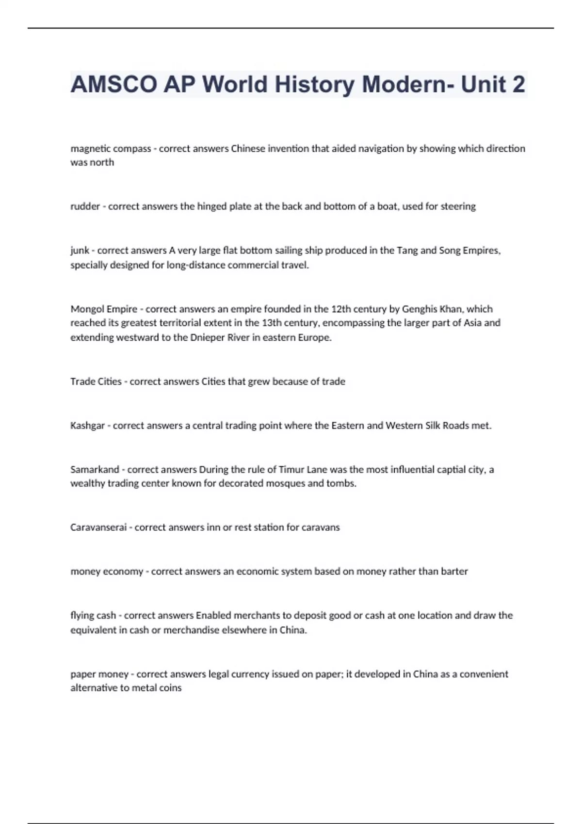 AMSCO AP World History Modernmagnetic compass - correct answers Chinese invention that aided navigation by showing which direction was north rudder - correct answers the hinged plate at the back and bottom of a boat, used for steering junk - correct answers A very large flat bottom sailing ship produced in the Tang and Song Empires, specially designed for long-distance commercial travel. Mongol Empire - correct answers an empire founded in the 12th century by Genghis Khan, which reached its greatest territorial extent in the 13th century, encompassing the larger part of Asia and extending westward to the Dnieper River in eastern Europe. Trade Cities - correct answers Cities that grew because of trade Kashgar - correct answers a central trading point where the Eastern and Western Silk Roads met. Samarkand - correct answers During the rule of Timur Lane was the most influential captial city, a wealthy trading center known for decorated mosques and tombs. Caravanserai - correct answers inn or rest station for caravans money economy - correct answers an economic system based on money rather than barter flying cash - correct answers Enabled merchants to deposit good or cash at one location and draw the equivalent in cash or merchandise elsewhere in China. paper money - correct answers legal currency issued on paper; it developed in China as a convenient alternative to metal coins Banking Houses - correct answers These European banks developed during the Middle Ages to aid trade. Along with innovations such as bills of exchange, or bank drafts, and credit, the rise of banking houses supported the development of interregional trade in luxury goods. bill of exchange - correct answers issued by a banker in one city to a merchant who could exchange it for cash in a distant city, thus freeing him from traveling with gold, which was easily stolen Hanseatic League - correct answers An economic and defensive alliance of the free towns in northern Germany, founded about 1241 and most powerful in the fourteenth century. Mongols - correct answers A people of this name is mentioned as early as the records of the Tang Empire, living as nomads in northern Eurasia. After 1206 they established an enormous empire under Genghis Khan, linking western and eastern Eurasia. Khan - correct answers A Mongol ruler Kuriltai - correct answers Meeting of all Mongol chieftains at which the supreme ruler of all tribes was selected Genghis Khan - correct answers Founder of the Mongol Empire. Khanates - correct answers Four regional Mongol kingdoms that arose following the death of Chinggis Khan. Pax Mongolica - correct answers The period of approximately 150 years of relative peace and stability created by the Mongol Empire. Batu - correct answers ruler of the golden horde; one of Chinggis Khan's grandsons; responsible for the invasion of Russia beginning in 1236. Golden Horde - correct answers Mongol khanate founded by Genghis Khan's. It was based in southern Russia and quickly adopted both the Turkic language and Islam. Also known as