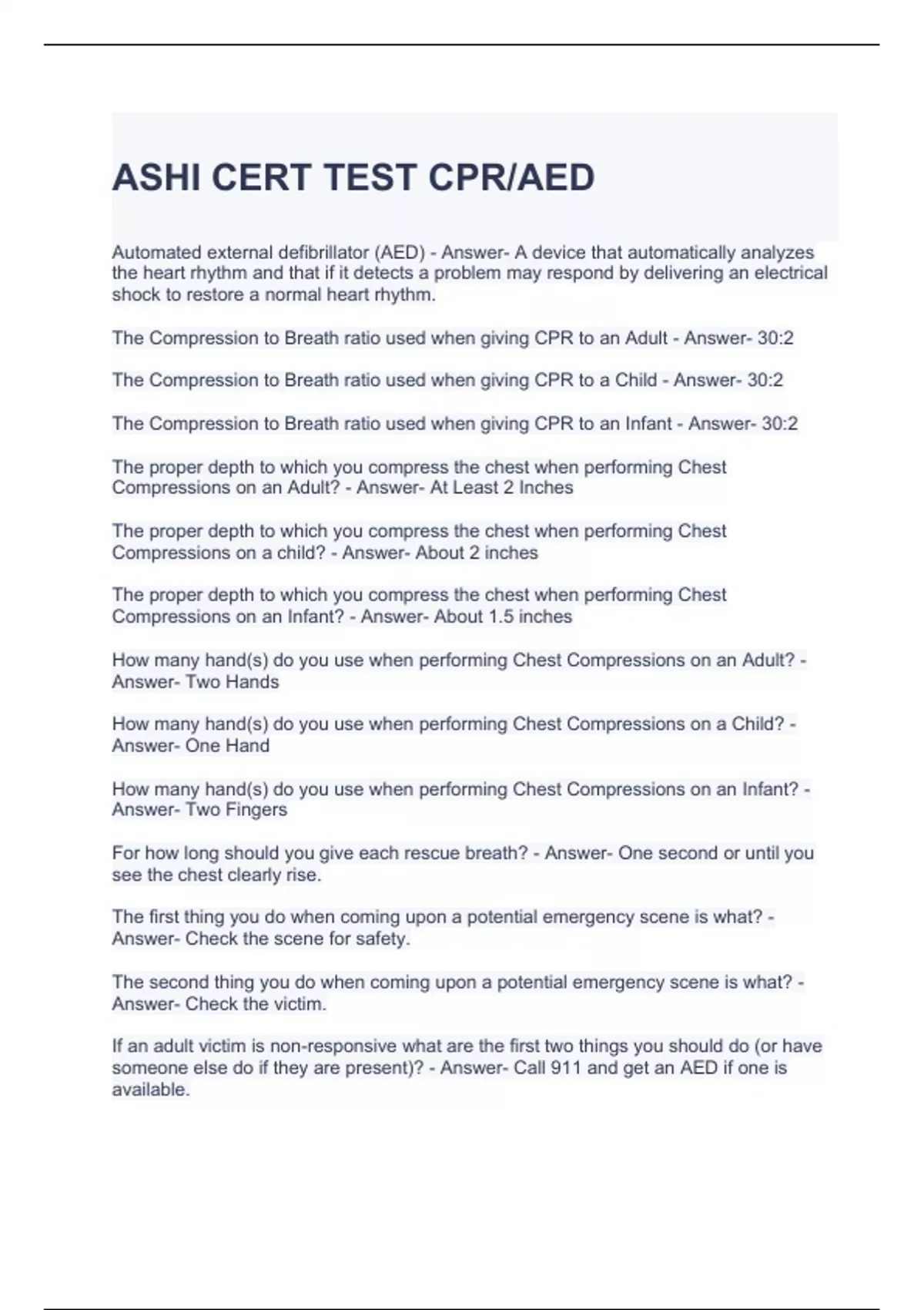 ASHI CERT TEST CPR-AED QUESTIONS ANSWERS