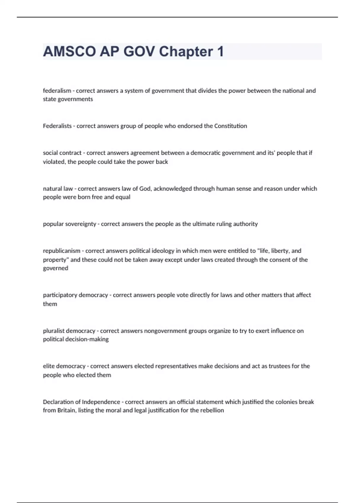 AMSCO AP GOV Chapter 1federalism - correct answers a system of government that divides the power between the national and state governments Federalists - correct answers group of people who endorsed the Constitution social contract - correct answers agreement between a democratic government and its' people that if violated, the people could take the power back natural law - correct answers law of God, acknowledged through human sense and reason under which people were born free and equal popular sovereignty - correct answers the people as the ultimate ruling authority republicanism - correct answers political ideology in which men were entitled to "life, liberty, and property" and these could not be taken away except under laws created through the consent of the governed participatory democracy - correct answers people vote directly for laws and other matters that affect them pluralist democracy - correct answers nongovernment groups organize to try to exert influence on political decision-making elite democracy - correct answers elected representatives make decisions and act as trustees for the people who elected them Declaration of Independence - correct answers an official statement which justified the colonies break from Britain, listing the moral and legal justification for the rebellion Articles of Confederation - correct answers series of statements that defined the initial national government and redefined the former colonies as states extradition - correct answers states were expected to return fugitives to states where they had committed crimes and runaway slaves to states that they had fled James Madison - correct answers his influence in creating the plan for the new government and his stalwart support of it during the ratification process earned him the nickname Father of the Constitution Virginia Plan - correct answers proposed three-branch system of government, bicameral legislature, and made the national government supreme over the states which became blueprint for the Constitution bicameral - correct answers two-house separation of powers - correct answers distinct responsibilities and limits of each branch to keep any one branch from becoming too powerful New Jersey Plan - correct answers proposed system of government in which states would retain sovereignty Grand Committee - correct answers committee made up of one delegate from each of the states represented at the convention Great Compromise - correct answers compromise between Virginia and New Jersey Plan House of Representatives - correct answers house of Congress which would award seats based on population of state Senate - correct answers house of Congress which would receive two senators from each state regardless of the state's size