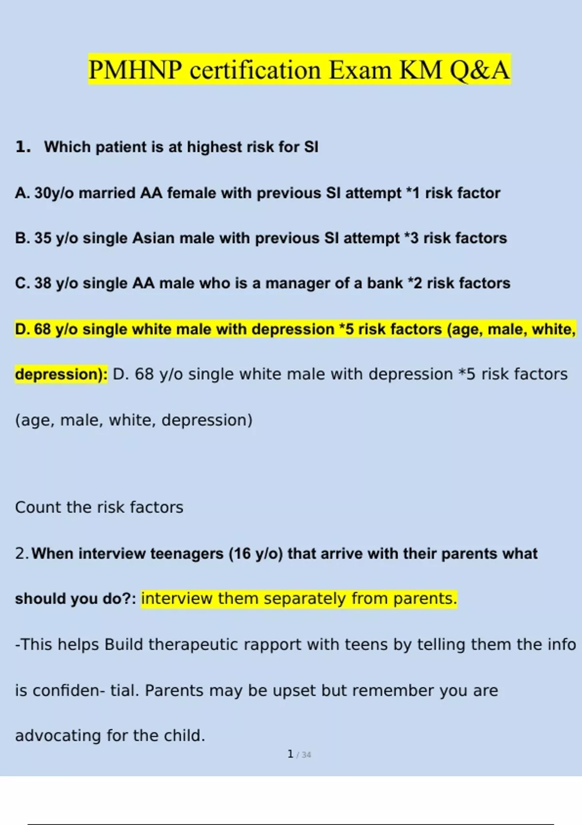 PMHNP Certification Exam KM (Actual test questions verified A+) 434 Questions with 100% Correct Answers