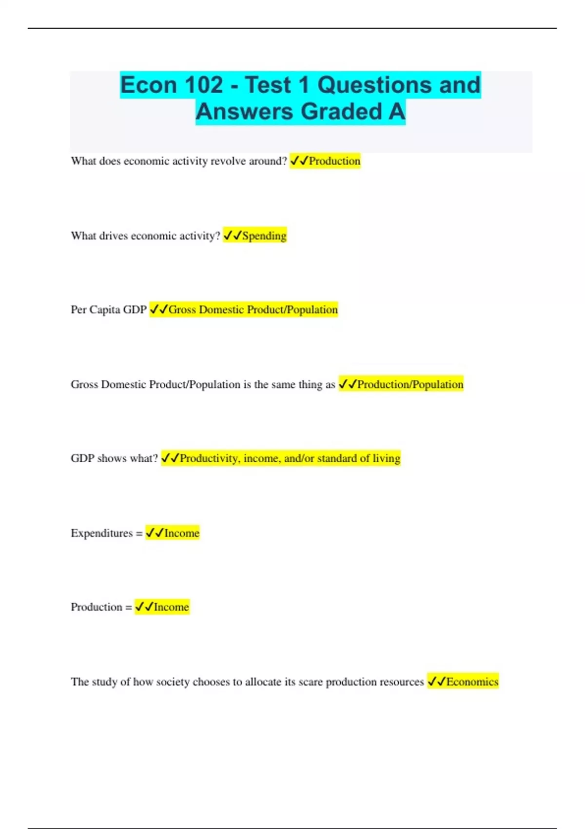 Econ 102 - Test 1 Questions and Answers Graded A What does economic activity revolve around? Production What drives economic activity? Spending Per Capita GDP Gross Domestic Product/Population Gross Domestic Product/Population is the same thing as Production/Population GDP shows what? Productivity, income, and/or standard of living Expenditures = Income Production = Income The study of how society chooses to allocate its scare production resources Economics Labor Mental and physical skills Capital Goods used to produce other goods/services (an oven to produce cake) Land Natural Resources Entrepreneurial Talent The assembling of resources to produce new or improved products and technologies Scarcity Lack of enough resources to satisfy all desired uses of those resources Factors of production Resource inputs used to produce goods and services (land, labor, capital, and entrepreneurship) Opportunity cost The most desired goods or services that are foregone to obtain something else (only measured in the most highly valued thing given up) Macroeconomics The study of the overall economy Microeconomics They study of the behavior of individual economic units Key economic questions 1. How much should you produce? 2. How much should you sell for? 3. How are you going to produce? Economy A particular system of organization for the production, distribution, and consumption of goods and services Centrally planned economy (Command Economy) Resources are allocated by a central planning agency of the government (i.e.: North Korea) Market economy Resources are allocated by way of individual buyers and sellers Mixed economy Resources are allocated by elements of a command economy and a market economy (i.e.: The US) Production Possibilities Curve (PPC) Maximum combination of goods and services we can produce with existing resources and technology. Shows potential output Qualities of a PPC 1. Production is limited to 2 types of goods and services 2. All resources have to be efficiently employed (max amount of output for a given amount of input - no unemployment or underemployment) 3. All resources are fixed 4. All technology is fixed Unemployment of resources When resources that could be used for production are not being used Underemployment of resources A job that is insufficient in some important way for a worker, relative to a standard, which results in the under-utilization of the worker (i.e.: a construction worker making cookies) Shift to the left in the PPC Economic recession/contraction Shift to the right in the PPC Economic growth/expansion (increase in output and an expansion of production possibilities) Purpose of a PPC 1. Shows points of efficient & inefficient production 2. Shows the outcome of product mix (combination of goods & services you get) 3. Shows opportunity cost 4. Shows economic growth & contraction Law of increasing opportunity cost The opportunity cost of producing a good or service starts to increase as more & more of that good or service is produced A. Capital goods: 48 - Consumer goods: 10 B. Capital goods: 20 - Consumer goods: 40 What is the opportunity cost of producing consumer goods between A and B? 28 units of capital goods Opportunity cost of producing consumer goods is expressed in units of what? Capital goods Average total cost = Total cost divided by quantity Average fixed cost = Total fixed cost divided by quantity Average variable cost = Total variable cost divided by quantity Profit divided by loss = Total revenue - total cost Total cost = P (unit cost) * Q (quantity) OR (total fixed cost + total variable cost) When incurring a major loss, the SHORT RUN solution is to ______________________________. Stop producing When incurring a major loss, the LONG RUN solution is to _____________________________. Exit the industry by getting rid of all inventory and assets At shutdown: Total revenue=? Total Variable Cost=? TR= Zero TVC= Zero so, Profit/Loss= -TFC Shutdown when __________. TR < TVC Law of Demand How consumers respond to change in price The Q demanded of a good/service varies _________ with price Inversely What causes changed in non-price activities? (hint: changes in non-price cause SHIFT on demand curve) 1. change in number of customers 2. changes in consumer income 3. change in consumer taste 4. change in price of a related good 5. change in customer expectations What causes movement along demand curve? Change in price What causes shift of demand curve? Change in non-price Market Free-wheeling exchange of goods and services, anything that brings together buyers and sellers Demand The quantity of a good or service consumers would be willing and able to buy at various prices Pent up demand Willing to buy, but not able to (during a recession) Price is always on the __________________ axis Vertical Quantity demanded is always on the _________________ axis Horizontal When the demand curve shifts to the right, the quantity demanded has _____________ Increased When the demand curve shifts to the left, the quantity demanded has _________________ Decreased The PPC illustrates what? The law of increasing opportunity costs (increasing quantities of any good can be obtained by only sacrificing increasing quantities of other goods) Human capital The knowledge and skills possessed by the workforce Capital Intensive Production processes that use a high ratio of capital to labor inputs