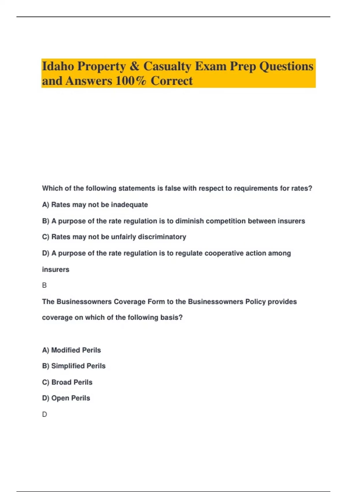 Idaho Property & Casualty Exam Prep Questions and Answers 100% Correct