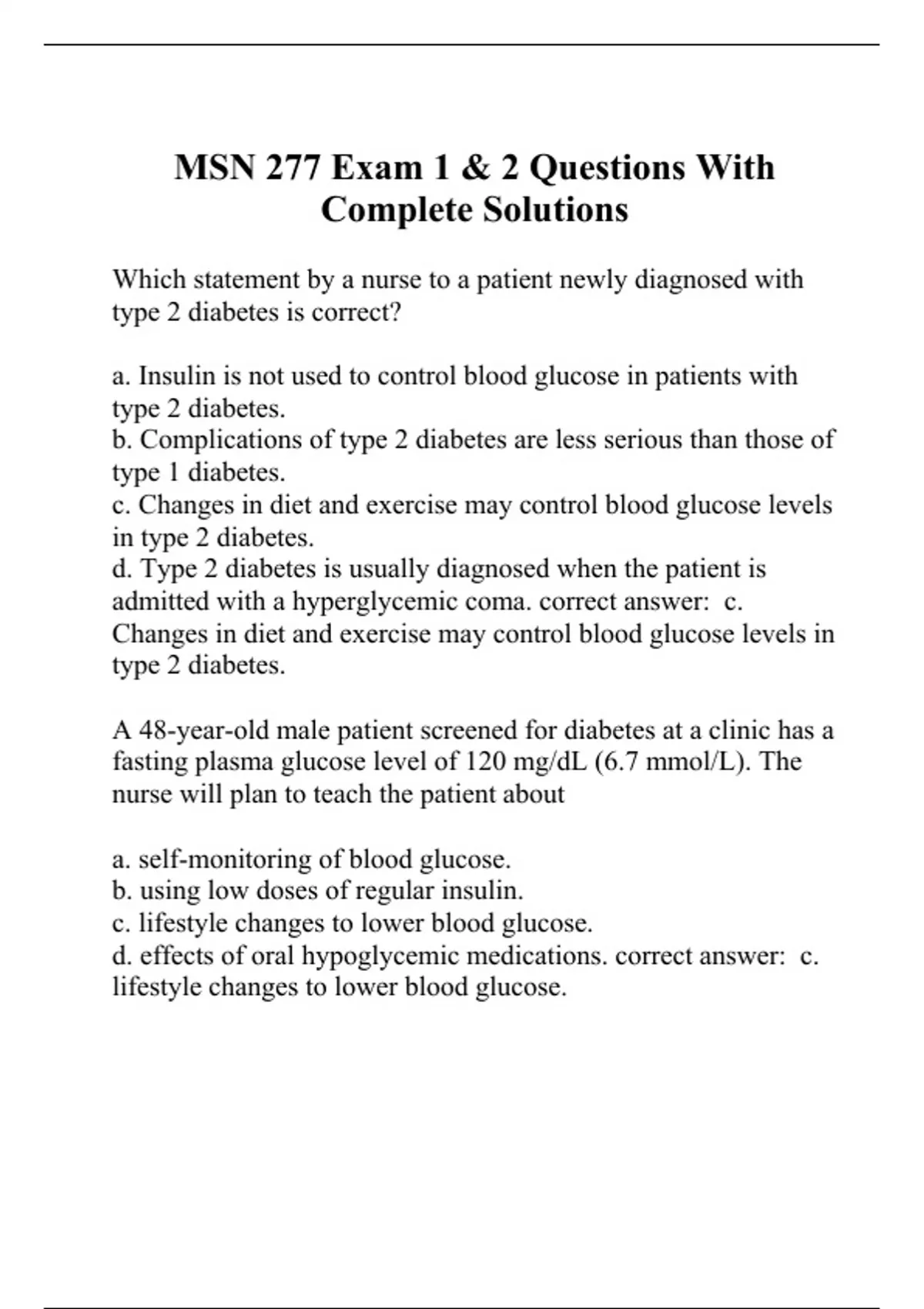 d. Type 2 diabetes is usually diagnosed when the patient is admitted with a hyperglycemic coma. correct answer: c. Changes in diet and exercise may control blood glucose levels in