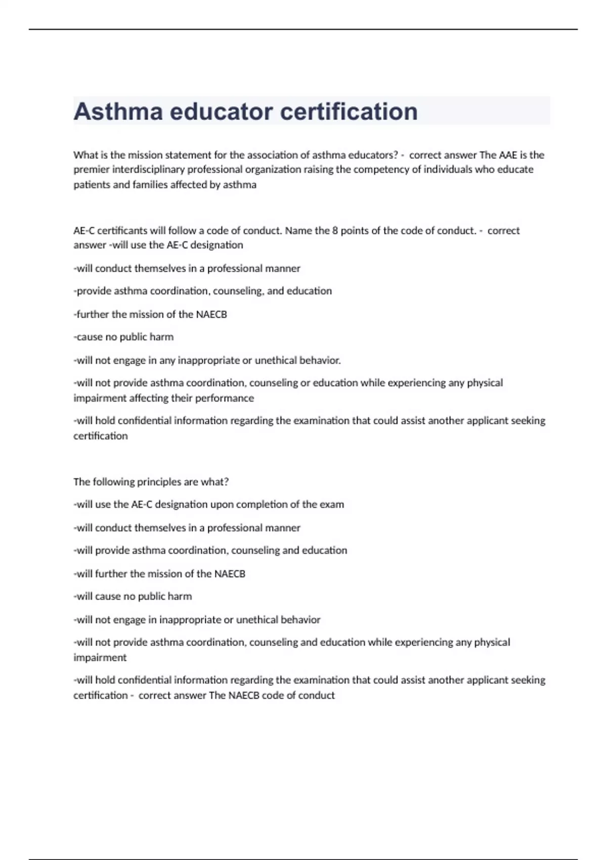 Asthma educator certification Question and answers 100% correct 2023/2024 What is the mission statement for the association of asthma educators? - correct answer The AAE is the premier interdisciplinary professional organization raising the competency of individuals who educate patients and families affected by asthma AE-C certificants will follow a code of conduct. Name the 8 points of the code of conduct. - correct answer -will use the AE-C designation -will conduct themselves in a professional manner -provide asthma coordination, counseling, and education -further the mission of the NAECB -cause no public harm -will not engage in any inappropriate or unethical behavior. -will not provide asthma coordination, counseling or education while experiencing any physical impairment affecting their performance -will hold confidential information regarding the examination that could assist another applicant seeking certification The following principles are what? -will use the AE-