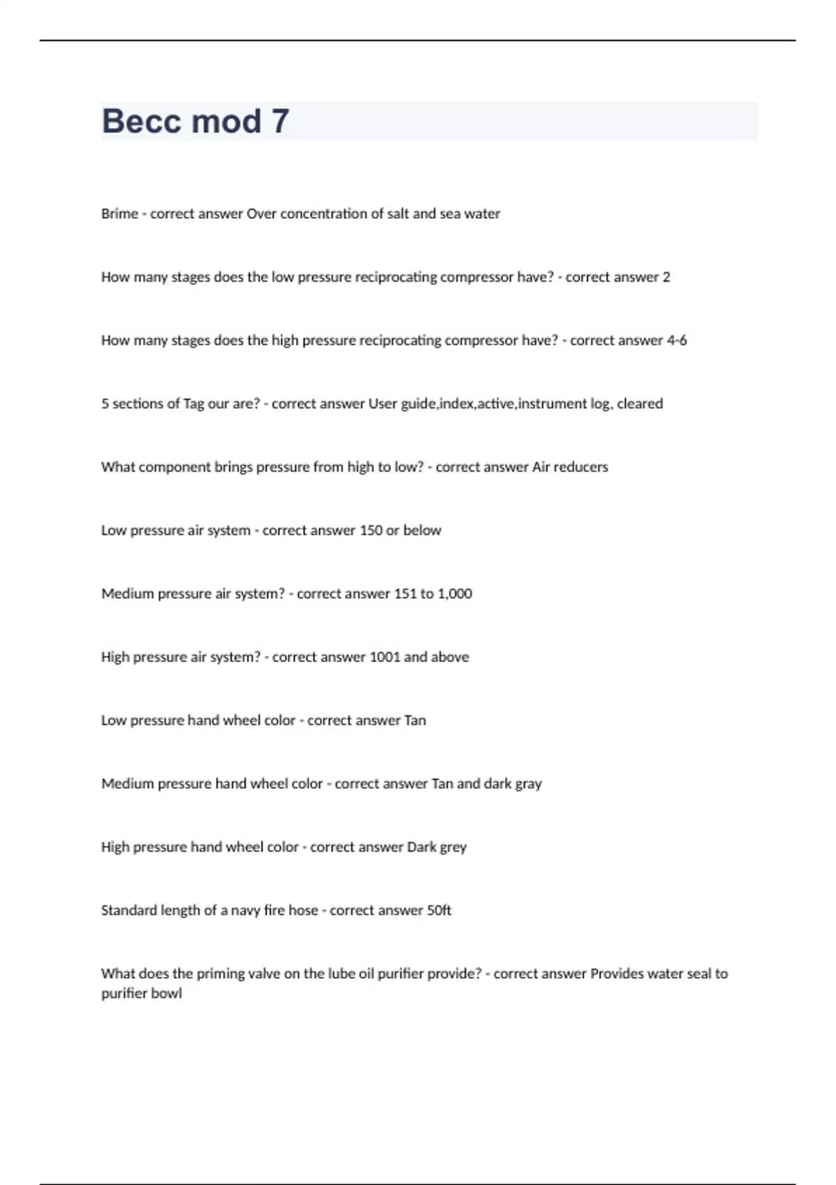 Becc mod 7 Question and answers 100% correct 2023/2024Brime - correct answer Over concentration of salt and sea water How many stages does the low pressure reciprocating compressor have? - correct answer 2 How many stages does the high pressure reciprocating compressor have? - correct answer 4-6 5 sections of Tag our are? - correct answer User guide,index,active,instrument log, cleared What component brings pressure from high to low? - correct answer Air reducers Low pressure air system - correct answer 150 or below