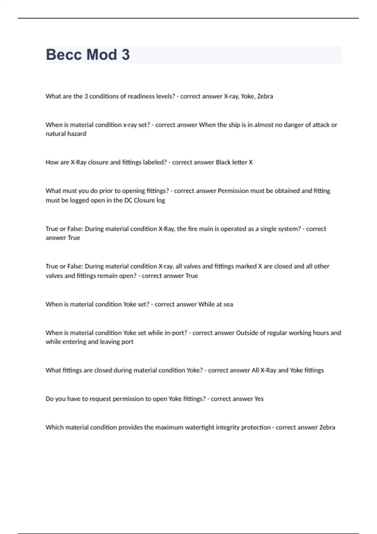 Becc Mod 3- Question and answers 100% correct 2023/2024What are the 3 conditions of readiness levels? - correct answer X-ray, Yoke, Zebra When is material condition x-ray set? - correct answer When the ship is in almost no danger of attack or natural hazard How are X-Ray closure and fittings labeled? - correct answer Black letter X What must you do prior to opening fittings? - correct answer Permission must be obtained and fitting must be logged open in the DC Closure log True or False: During material condition X-Ray, the fire main is operated as a single system? - correct answer True