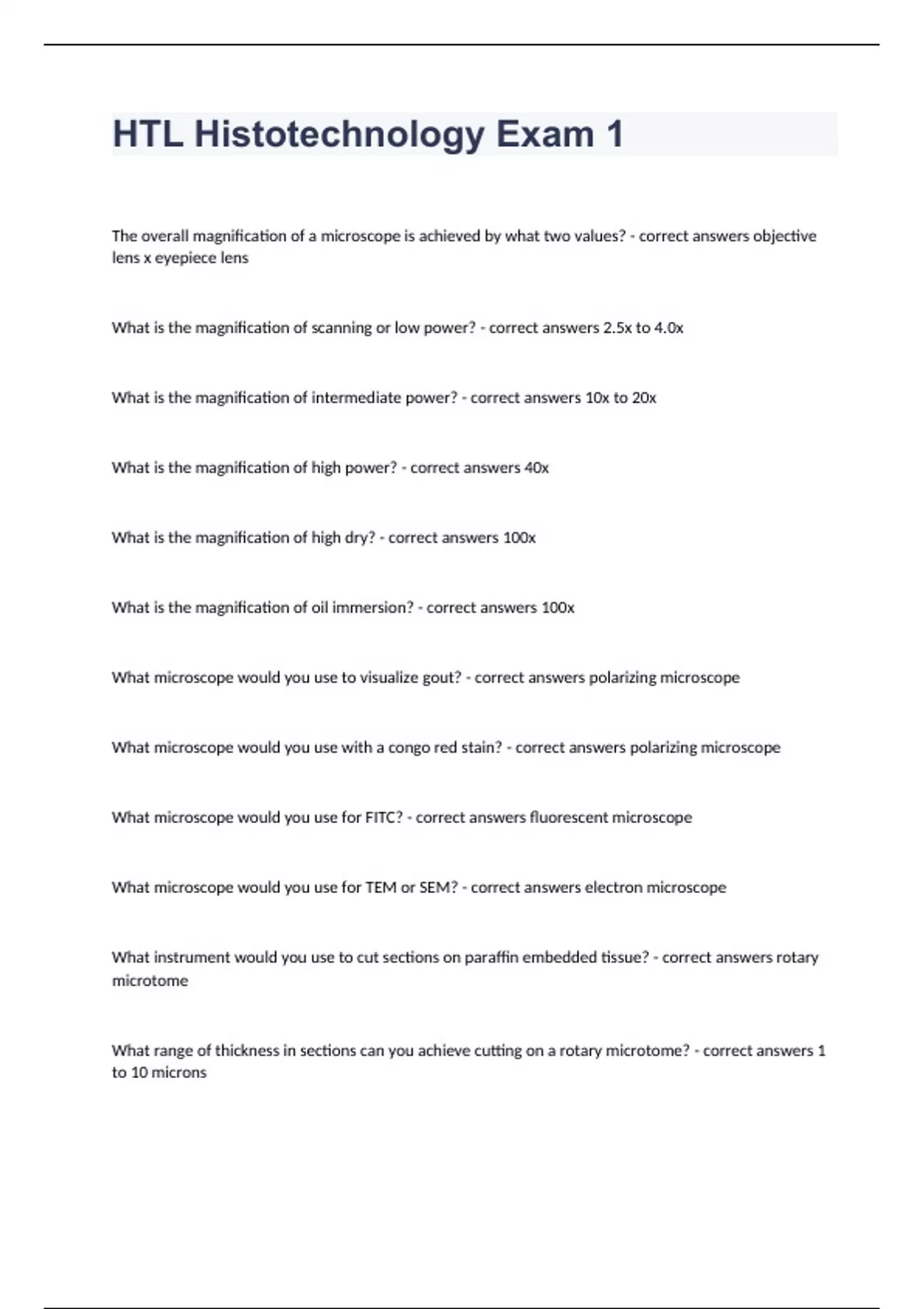 HTL Histotechnology Exam 1The overall magnification of a microscope is achieved by what two values? - correct answers objective lens x eyepiece lens What is the magnification of scanning or low power? - correct answers 2.5x to 4.0x What is the magnification of intermediate power? - correct answers 10x to 20x What is the magnification of high power? - correct answers 40x What is the magnification of high dry? - correct answers 100x What is the magnification of oil immersion? - correct answers 100x What microscope would you use to visualize gout? - correct answers polarizing microscope What microscope would you use with a congo red stain? - correct answers polarizing microscope What microscope would you use for FITC? - correct answers fluorescent microscope What microscope would you use for TEM or SEM? - correct answers electron microscope What instrument would you use to cut sections on paraffin embedded tissue? - correct answers rotary microtome What range of thickness in sections can you achieve cutting on a rotary microtome? - correct answers 1 to 10 microns What is the average thickness of a cut paraffin section using a rotary microtome? - correct answers 3-4 microns List a few challenges that may occur in cutting paraffin blocks? - correct answers tiny specimens, inadequately decalcified tissue, poorly infiltrated tissue, blocks with foreign bodies, dull or poor quality blades, blocks not cooled long enough What is the typical temperature inside a cryostat? - correct answers -20 to -30 degrees Celsius What is the typical temperature maintained in slide drying ovens? - correct answers 65-68 degrees Celsius How long are slides dried for in the drying oven? - correct answers 10-15 minutes What is the temperature range of the different freezers in the lab? - correct answers -10 to -80 degrees Celsius What is the typical temperature range of the refrigerator in the lab? - correct answers 1-5 degrees Celsius What is the term of the instrument used for floating paraffin ribbons? - correct answers flotation bath What temperature should the DI water or tap water be in the flotation baths? - correct answers 10 degrees cooler than the melting point of paraffin What magnification is needed for studying cells and cell structure? - correct answers 400x to 1000x What is the term used with microscopes that means if you have focused on an object using one objective, the microscope will still be coarsely focused when you switch to a different objective. All you need to do is adjust the fine focus a bit. - correct answers parfocal Is the ability of the components of a microscope to measure the angular separation of the points in an object. - correct answers resolution Is the minimum distance between distinguishable objects in an image. - correct answers minimum resolvable distance or resolution What is the resolving power of the naked eye? - correct answers 1 cm to 0.5 cm What is the resolving power of microscopes? - correct answers 0.2 microns Is the artifact produced in microscopy when two different wavelengths of light are passing through an object. - correct answers chromatic refraction (aberration) What part of the microscope corrects for chromatic refraction (aberration)? - correct answers objective _________ objectives correct for two colors (red and blue) - correct answers achromatic _______ correct for 3 colors and are more expensive. - correct answers apochromatic
