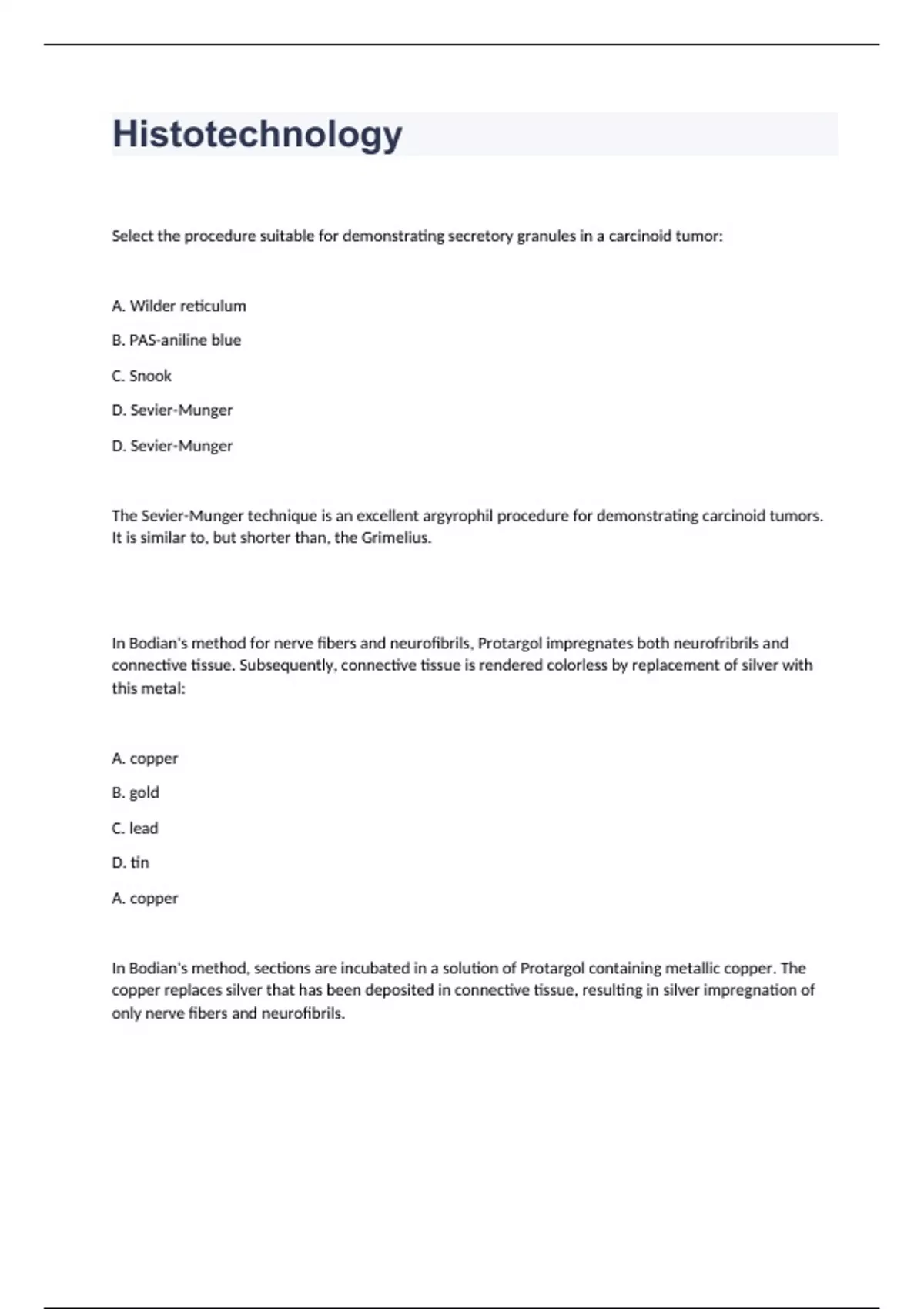 Select the procedure suitable for demonstrating secretory granules in a carcinoid tumor: A. Wilder reticulum B. PAS-aniline blue C. Snook D. Sevier-Munger D. Sevier-Munger The Sevier-Munger technique is an excellent argyrophil procedure for demonstrating carcinoid tumors. It is similar to, but shorter than, the Grimelius. In Bodian's method for nerve fibers and neurofibrils, Protargol impregnates both neurofribrils and connective tissue. Subsequently, connective tissue is rendered colorless by replacement of silver with this metal: A. copper B. gold C. lead D. tin A. copper In Bodian's method, sections are incubated in a solution of Protargol containing metallic copper. The copper replaces silver that has been deposited in connective tissue, resulting in silver impregnation of only nerve fibers and neurofibrils. What is the thickness of most standard glass slides? A. 0.5 mm B. 1.5 mm C. 3.0 mm D. None of the above B. 1.5 mm Which of the following probe types are used to detect a translocation? A. Centromere probes B. Break-apart probes C. Locus-specific probes B. Break-apart probes Break-apart probes target two areas of a specific gene sequence in order to detect a translocation. When a break in the gene sequence occurs, the green and red signal will NOT be close together anymore and will thus appear as separate green and red signals A centromere probe targets the centromeric region of the particular chromosome. These probes allow us to enumerate the number of centromeres and thus chromosomes of a particular kind. A locus-specific probe targets a specific gene sequence of interest. These probes can be used to determine whether a gene is amplified, deleted, or present in a normal copy number. ONLY monoclonal antibodies can be used for immunohistochemical (IHC) techniques for the demonstration of infectious diseases. A. True B. False B. False The histology section of the laboratory had 12,652 labor hours for the year. How many FTEs (full-time equivalents) were used by this section? A. 4. B. 5.70 C. 6.10 D. 9. B. 5.70 To calculate FTEs, or full-time equivalents, divide the total number of hours of all the employees (total paid hours, productive or worked hours, and nonproductive or benefit hours) by 2080, the number of hours a full-time person works in one (1) year. This is calculated by multiplying 40 hrs/week X 52 weeks/yr. = 2080 15. [12,652 total hrs. / 2,080 hr/person = 6.1 FTEs] Fluorescence in situ hybridization (FISH) can be used to qualify patients for chemotherapy. A. True B. False A. True Orth solution is prepared with which of the following constituents? A. mercuric chloride, potassium dichromate, and sodium sulfate B. potassium dichromate, sodium sulfate, and 37-40% formaldehyde C. potassium dichromate, sodium sulfate, and absolute alcohol D.mercuric chloride, sodium sulfate, and 37-40% formaldehyde B. potassium dichromate, sodium sulfate, and 37-40% formaldehyde Helicobacter pylori is a causative bacteria linked to duodenal ulcers, MALT lymphomas, and stomach cancers. A. True B. False A. True Low profile blades (or feathers) require more frequent sharpening, unlike the high profile blades. A. True B. False B. False Low profile and high profile "blades" are disposable and do not require sharpening. Which dye groupe would normally be chosen to stain Nissl bodies: A. quinoneimine B. Azo C. Xanthene D. anthraquinone