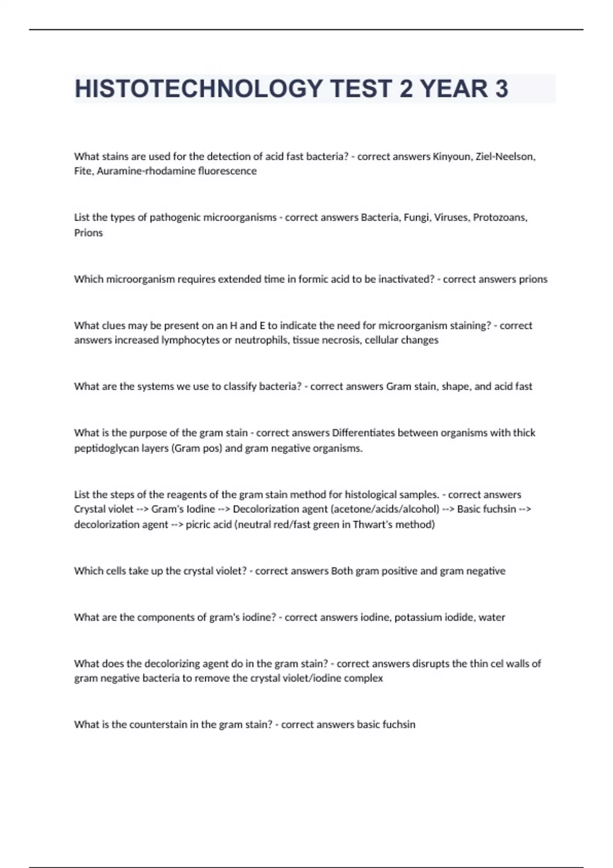 HISTOTECHNOLOGY TEST 2 YEAR 3 What stains are used for the detection of acid fast bacteria? - correct answers Kinyoun, Ziel-Neelson, Fite, Auramine-rhodamine fluorescence List the types of pathogenic microorganisms - correct answers Bacteria, Fungi, Viruses, Protozoans, Prions Which microorganism requires extended time in formic acid to be inactivated? - correct answers prions What clues may be present on an H and E to indicate the need for microorganism staining? - correct answers increased lymphocytes or neutrophils, tissue necrosis, cellular changes What are the systems we use to classify bacteria? - correct answers Gram stain, shape, and acid fast What is the purpose of the gram stain - correct answers Differentiates between organisms with thick peptidoglycan layers (Gram pos) and gram negative organisms. List the steps of the reagents of the gram stain method for histological samples. - correct answers Crystal violet --> Gram's Iodine --> Decolorization agent (acetone/acids/alcohol) --> Basic fuchsin --> decolorization agent --> picric acid (neutral red/fast green in Thwart's method) Which cells take up the crystal violet? - correct answers Both gram positive and gram negative What are the components of gram's iodine? - correct answers iodine, potassium iodide, water What does the decolorizing agent do in the gram stain? - correct answers disrupts the thin cel walls of gram negative bacteria to remove the crystal violet/iodine complex What is the counterstain in the gram stain? - correct answers basic fuchsin What does picric acid, or neutral red/ fast green stain in the gram stain? - correct answers Remaining tissue elements that are not bacteria Which type of bacteria are best detected using acid fast methods? - correct answers Mycobacteria What are mycobacteria? - correct answers Rods that exhibit fungus-like, filamentous growth Why do mycobacteria not stain well with the gram stain? - correct answers Mycolic acid in their capsules make them resistant What is the general principle of acid fast staining? - correct answers Acid fast positive organisms have a high proportion of lipids in their cell capsules which make them resistant to decolorization by dilute mineral acids. What is the primary stain for the Kinyoun method? - correct answers carbol-fuchsin What is the decolorizing agent for Kinyoun method? - correct answers dilute mineral acid Why can't Kinyoun be used to detect M. leprae - correct answers It has a more fragile lipid capsule Which fixatives should be avoided with Kinyoun methods? - correct answers Alcoholic based fixatives can dissolve the mycolic acids (Carnoy's, Gendre, Zinc formalin) True or false: Carbol-fuchsin is more soluble in lipids - correct answers True How is cross contamination avoided when performing acid fast techniques? - correct answers A second control tissue with uterus is run alongside the acid fast tissue and used with the same waterbath, microtome, etc. and it should be negative for AFB.