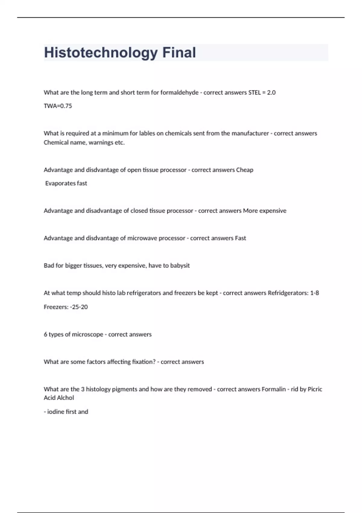 Histotechnology FinalWhat are the long term and short term for formaldehyde - correct answers STEL = 2.0 TWA=0.75 What is required at a minimum for lables on chemicals sent from the manufacturer - correct answers Chemical name, warnings etc. Advantage and disdvantage of open tissue processor - correct answers Cheap Evaporates fast Advantage and disadvantage of closed tissue processor - correct answers More expensive Advantage and disdvantage of microwave processor - correct answers Fast Bad for bigger tissues, very expensive, have to babysit At what temp should histo lab refrigerators and freezers be kept - correct answers Refridgerators: 1-8 Freezers: -25-20 6 types of microscope - correct answers What are some factors affecting fixation? - correct answers What are the 3 histology pigments and how are they removed - correct answers Formalin - rid by Picric Acid Alchol - iodine first and What is formalin? What concentration - correct answers Formalin is a gas which is dissolved in water WHich simple fixatives can decalicfy tiisue? - correct answers Picric acid and acetic acid Is chloroform flammable? - correct answers No