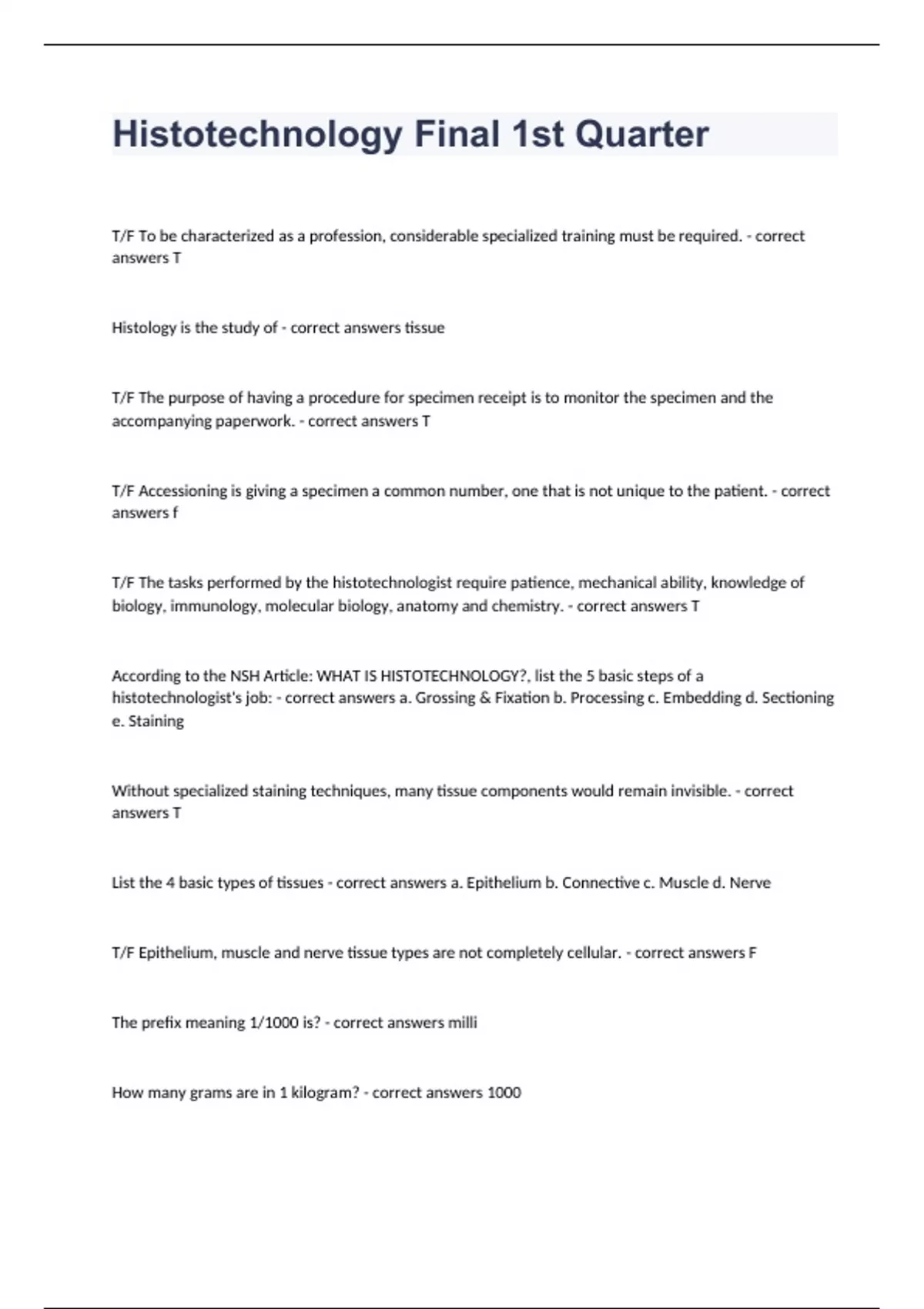 Histotechnology Final 1st QuarterT/F To be characterized as a profession, considerable specialized training must be required. - correct answers T Histology is the study of - correct answers tissue T/F The purpose of having a procedure for specimen receipt is to monitor the specimen and the accompanying paperwork. - correct answers T T/F Accessioning is giving a specimen a common number, one that is not unique to the patient. - correct answers f T/F The tasks performed by the histotechnologist require patience, mechanical ability, knowledge of biology, immunology, molecular biology, anatomy and chemistry. - correct answers T According to the NSH Article: WHAT IS HISTOTECHNOLOGY?, list the 5 basic steps of a histotechnologist's job: - correct answers a. Grossing & Fixation b. Processing c. Embedding d. Sectioning e. Staining Without specialized staining techniques, many tissue components would remain invisible. - correct answers T List the 4 basic types of tissues - correct answers a. Epithelium b. Connective c. Muscle d. Nerve T/F Epithelium, muscle and nerve tissue types are not completely cellular. - correct answers F The prefix meaning 1/1000 is? - correct answers milli How many grams are in 1 kilogram? - correct answers 1000 An English quart is roughly equivalent to? - correct answers 1 L How many milligrams in one gram? - correct answers 1000 The meter is roughly equivalent to the English: - correct answers YARD Another term for "atomic mass" is: - correct answers ATOMIC WEIGHT The metric prefix "micro", with the exponential notation of 10-6, denotes this decimal placement - correct answers .000001 Referring to the listing of atomic weights (in Sheehan pg. 348, or Appendix of Lecture Handout) for calculating, find the molecular weight of Na2SO4 - correct answers 142 T/F Virchow brought modern experimental medicine into the day-to-day practice of physicians - correct answers T T/F Virchow's emphasis was on bone and skeletal mechanisms of disease - correct answers F T/F Virchow emphasized that the cell is really the ultimate morphological element in which there is any manifestation of life. - correct answers T T/F Proper and imprecise terminology was important to Virchow. - correct answers F T/F Virchow added the concept that cancer was an old growth or neoplastic process. - correct answers F 1 cm is equivalent to A. 10 micrometers B. 100 micrometers C. 1,000 micrometers D. 10,000 micrometers - correct answers D
