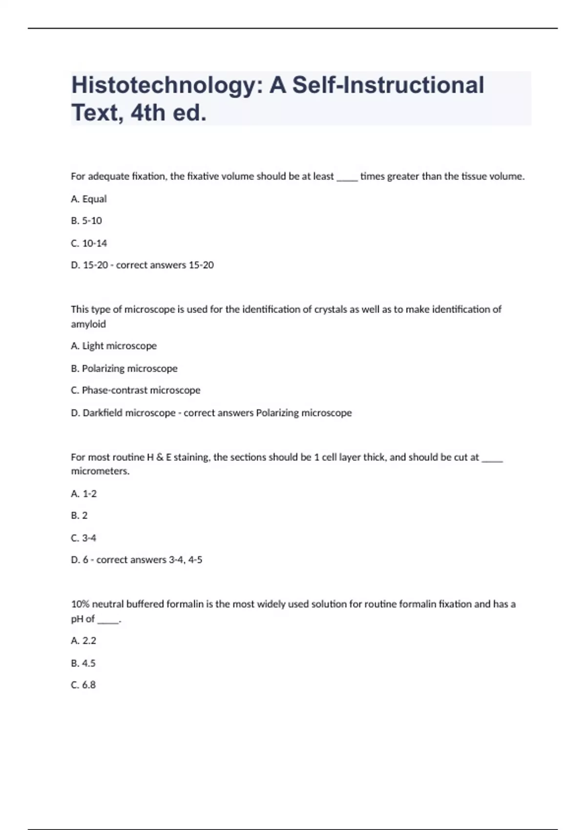 Histotechnology: A Self-Instructional Text, 4th edFor adequate fixation, the fixative volume should be at least ____ times greater than the tissue volume. A. Equal B. 5-10 C. 10-14 D. 15-20 - correct answers 15-20 This type of microscope is used for the identification of crystals as well as to make identification of amyloid A. Light microscope B. Polarizing microscope C. Phase-contrast microscope D. Darkfield microscope - correct answers Polarizing microscope For most routine H & E staining, the sections should be 1 cell layer thick, and should be cut at ____ micrometers. A. 1-2 B. 2 C. 3-4 D. 6 - correct answers 3-4, 4-5 10% neutral buffered formalin is the most widely used solution for routine formalin fixation and has a pH of ____. A. 2.2 B. 4.5 C. 6.8 D. 9.0 - correct answers 6.8 __________ is unique in that it is the only substance used in histotechnology both as a fixative ingredient and as a stain. A. Picric acid B. Osmium tetroxide C. Potassium dichromate D. B-5 - correct answers Picric acid Coagulant fixative, strong coagulant of nucleoprotein but leaves DNA soluble Which of the following is used in the dehydration of tissue? A. Ethyl alcohol B. Methyl alcohol C. Isopropyl alcohol D. All of the above - correct answers All of the above If the blade has too little of a tilt when cutting sections on the microtome, this issue can occur: A. Holes in sections B. Failure of ribbon to form C. Lengthwise scratches in the ribbon D. Varied thickness of sections (thick and thin) - correct answers Varied thickness of sections (thick and thin) - 30˚ Too much tilt: scraped rather than cut sections Carpal tunnel syndrome, trigger finger, tendonitis and thoracic outlet compression syndrome are all examples that result from this type of hazard: A. Biological or infectious B. Mechanical C. Chemical D. Fire - correct answers Mechanical Creutzfeldt-Jakob disease is a prion disease affecting primarily nervous tissue. The prions are extremely resistant unlike many other biological and infectious hazards. They are however susceptible to: A. 1 hour concentrated formic acid fixation B. 10% non-buffered formalin fixation C. Freezing D. Drying - correct answers 1 hour concentrated formic acid fixation and 5% sodium hypochlorite for 2 hours Autoclaving for 1 hour at 121˚C/132-134˚C and 2kg/cm2 Electrical fires that must be extinguished with nonconductive media are classified as ____ fires. A. Class A B. Class B C. Class C D. Class D - correct answers Class C Class A - Combustible materials: wood, plastics, paper, textiles Class B - Flammable liquids and gases Class D - Combustible and reactive elements