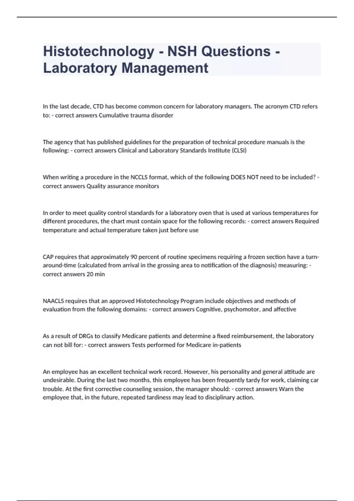 Histotechnology - NSH Questions - Laboratory Management 2023/2024 updated to pass