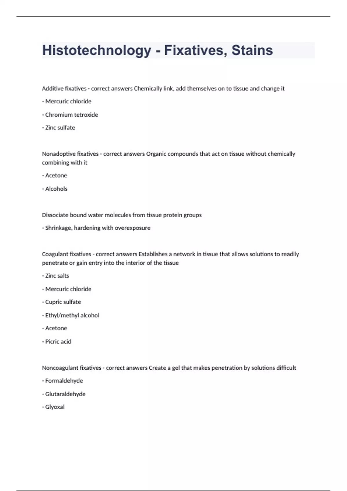 Histotechnology - Fixatives, Stains questions well answered graded A+ 2023/2024