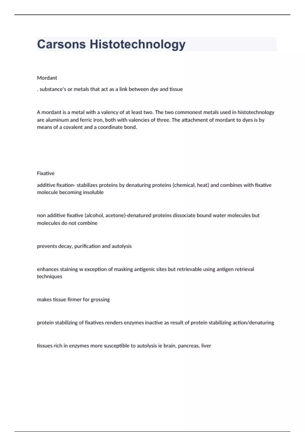Carsons Mordant . substance’s or metals that act as a link between dye and tissue A mordant is a metal with a valency of at least two. The two commonest metals used in histotechnology are aluminum and ferric iron, both with valencies of three. The attachment of mordant to dyes is by means of a covalent and a coordinate bond. Fixative additive fixation- stabilizes proteins by denaturing proteins (chemical, heat) and combines with fixative molecule becoming insoluble non additive fixative (alcohol, acetone)-denatured proteins dissociate bound water molecules but molecules do not combine prevents decay, purification and autolysis enhances staining w exception of masking antigenic sites but retrievable using antigen retrieval techniques makes tissue firmer for grossing protein stabilizing of fixatives renders enzymes inactive as result of protein stabilizing action/denaturing tissues rich in enzymes more susceptible to autolysis ie brain, pancreas, liver Amino NH2 and Hydroxyl -COOH groups at pH 7 formaldehyde adds on tissue proteins primarily at the amino group with eventual formation of a methylene bridge Coagulant fixative fixatives that form a gel which is difficult for subsequent reagents to penetrate Non coagulative fixative permeable meshwork of protein strands Factors affecting fixation temperature, size, volume ratio (15-20x) , time (6-24 hrs esp. Her2), penetration, tissue storage (formalin indefinitely, immunos affected), pH (7.2-7,4 EM, 4-9 for light), osmolality, Immediate vs delayed fixation improper fixation of lung tissue Well fixed lung poor vs well fixed tumor IF or enzyme profile no fixative/frozen chrommafin grannules found in cells of adrenal gland must be fixed in ortho solution Kidney bx for IF Micheles Nuclear bubbling nuclei often show coalescence of the chromatin into strands with intervening clear spaces. Introduced in the deparaffinization step on formalin-fixed tissue, because the nuclei are only delicately fixed What 2 chemicals will fix lipids so they are not lost during processing osmium tetroxide and chromic acid 100% Formalin 30-40% formaldehyde solution in water 10% formalin (or 3.7-4% formaldehyde) 1 part stock and 9 parts water