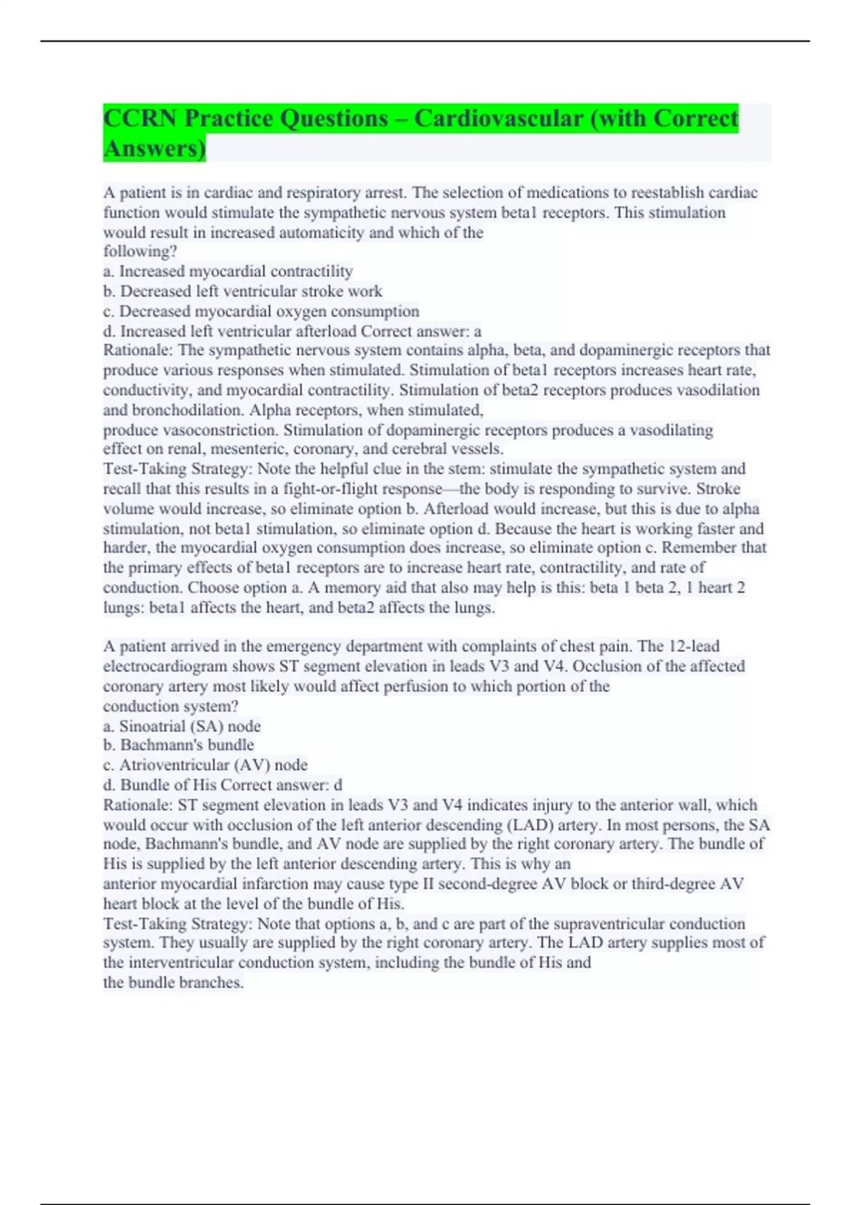 A patient is in cardiac and respiratory arrest. The selection of medications to reestablish cardiac function would stimulate the sympathetic nervous system beta1 receptors. This stimulation would result in increased automaticity and which of the following? a. Increased myocardial contractility b. Decreased left ventricular stroke work c. Decreased myocardial oxygen consumption d. Increased left ventricular afterload Correct answer: a Rationale: The sympathetic nervous system contains alpha, beta, and dopaminergic receptors that produce various responses when stimulated. Stimulation of beta1 receptors increases heart rate, conductivity, and myocardial contractility. Stimulation of beta2 receptors produces vasodilation and bronchodilation. Alpha receptors, when stimulated, produce vasoconstriction. Stimulation of dopaminergic receptors produces a vasodilating effect on renal, mesenteric, coronary, and cerebral vessels. Test-Taking Strategy: Note the helpful clue in the stem: stimulate the sympathetic system and recall that this results in a fight-or-flight response—the body is responding to survive. Stroke volume would increase, so eliminate option b. Afterload would increase, but this is due to alpha stimulation, not beta1 stimulation, so eliminate option d. Because the heart is working faster and harder, the myocardial oxygen consumption does increase, so eliminate option c. Remember that the primary effects of beta1 receptors are to increase heart rate, contractility, and rate of conduction. Choose option a. A memory aid that also may help is this: beta 1 beta 2, 1 heart 2 lungs: beta1 affects the heart, and beta2 affects the lungs. A patient arrived in the emergency department with complaints of chest pain. The 12-lead electrocardiogram shows ST segment elevation in leads V3 and V4. Occlusion of the affected coronary artery most likely would affect perfusion to which portion of the conduction system? a. Sinoatrial (SA) node b. Bachmann's bundle c. Atrioventricular (AV) node d. Bundle of His Correct answer: d Rationale: ST segment elevation in leads V3 and V4 indicates injury to the anterior wall, which would occur with occlusion of the left anterior descending (LAD) artery. In most persons, the SA node, Bachmann's bundle, and AV node are supplied by the right coronary artery. The bundle of His is supplied by the left anterior descending artery. This is why an anterior myocardial infarction may cause type II second-degree AV block or third-degree AV heart block at the level of the bundle of His. Test-Taking Strategy: Note that options a, b, and c are part of the supraventricular conduction system. They usually are supplied by the right coronary artery. The LAD artery supplies most of the interventricular conduction system, including the bundle of His and the bundle branches.