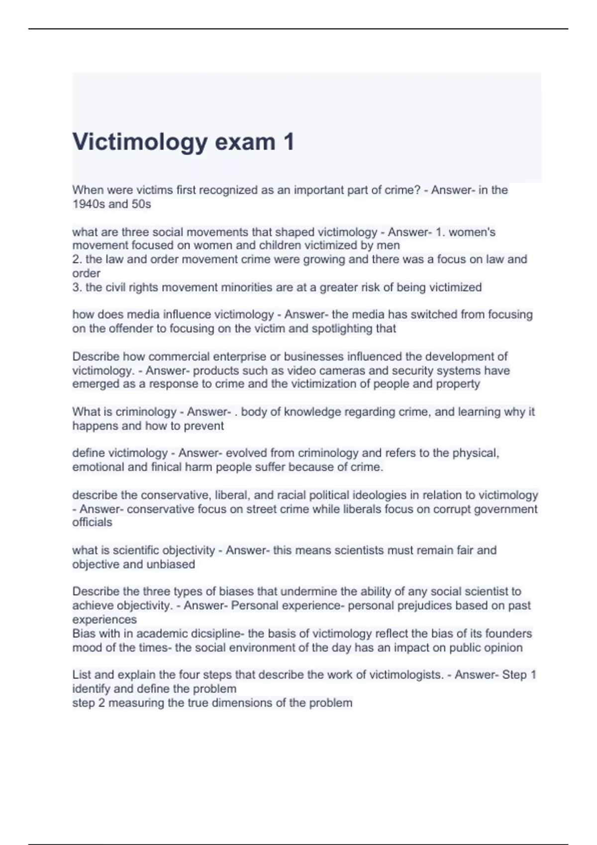 Victimology exam 1 with complete solutions