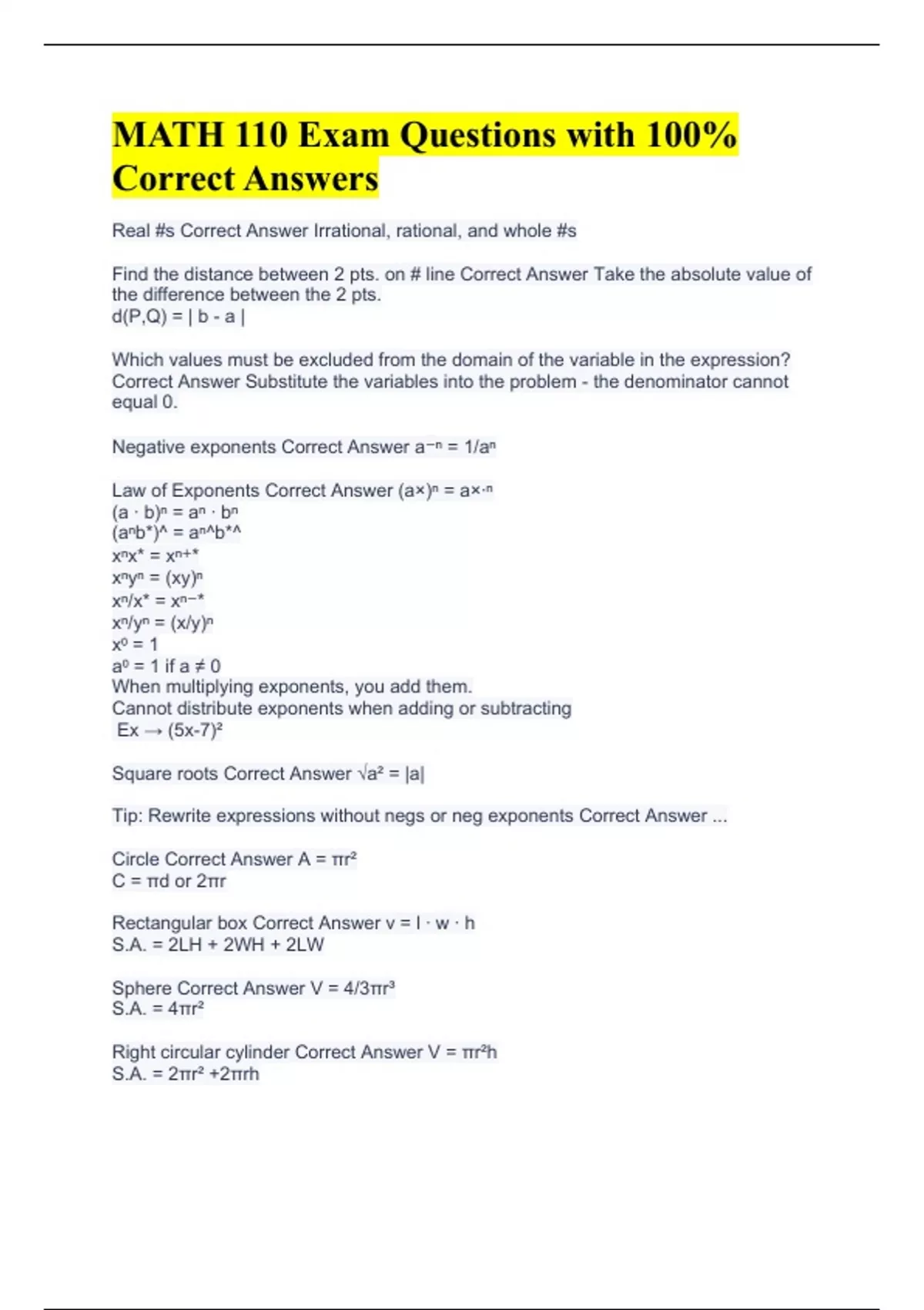 MATH 110 Exam Questions with 100% Correct Answers