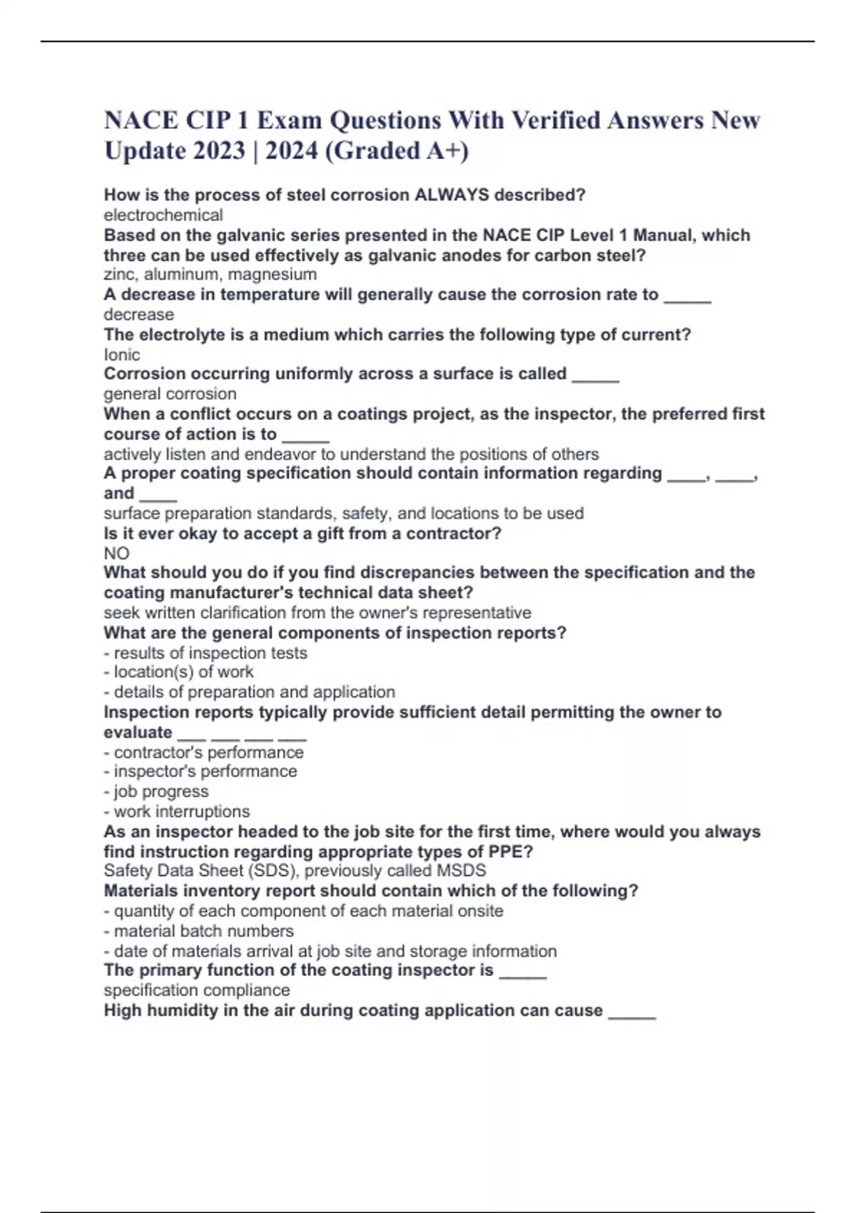 NACE CIP 1 Exam Questions With Verified Answers New Update 2023 | 2024 (Graded A+) How is the process of steel corrosion ALWAYS described? electrochemical Based on the galvanic series presented in the NACE CIP Level 1 Manual, which three can be used effectively as galvanic anodes for carbon steel? zinc, aluminum, magnesium A decrease in temperature will generally cause the corrosion rate to _____ decrease The electrolyte is a medium which carries the following type of current? Ionic Corrosion occurring uniformly across a surface is called _____ general corrosion When a conflict occurs on a coatings project, as the inspector, the preferred first course of action is to _____ actively listen and endeavor to understand the positions of others A proper coating specification should contain information regarding ____, ____, and ____ surface preparation standards, safety, and locations to be used Is it ever okay to accept a gift from a contractor? NO What should you do if you find discrepancies between the specification and the coating manufacturer's technical data sheet? seek written clarification from the owner's representative What are the general components of inspection reports? - results of inspection tests - location(s) of work - details of preparati
