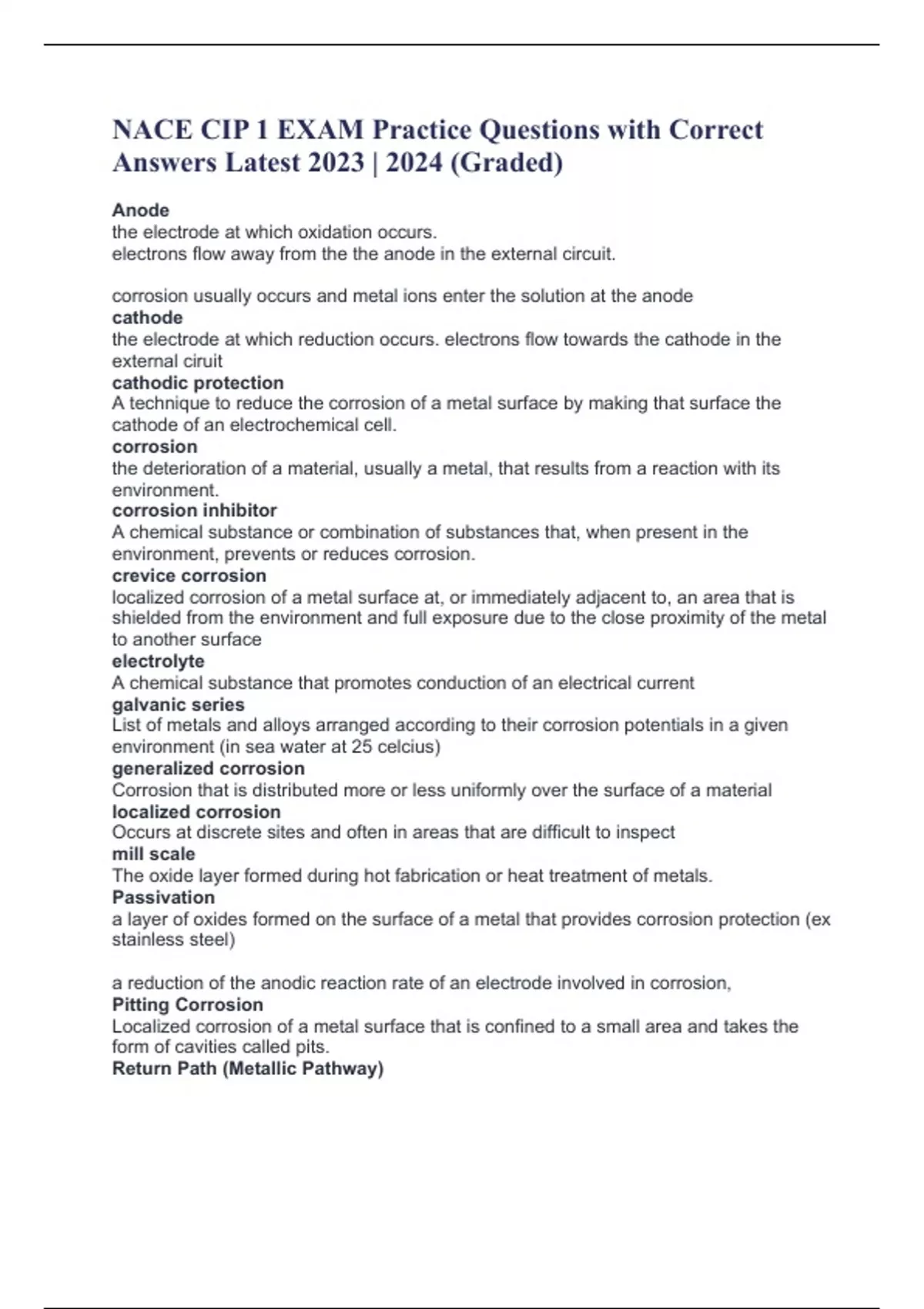 NACE CIP 1 EXAM Practice Questions with Correct Answers Latest 2023 | 2024 (Graded) Anode the electrode at which oxidation occurs. electrons flow away from the the anode in the external circuit. corrosion usually occurs and metal ions enter the solution at the anode cathode the electrode at which reduction occurs. electrons flow towards the cathode in the external ciruit cathodic protection A technique to reduce the corrosion of a metal surface by making that surface the cathode of an electrochemical cell. corrosion the deterioration of a material, usually a metal, that results from a reaction with its environment. corrosion inhibitor A chemical substance or combination of substances that, when present in the environment, prevents or reduces corrosion. crevice corrosion localized corrosion of a metal surface at, or immediately adjacent to, an area that is shielded from the environment and full exposure due to the close proximity of the metal to another surface electrolyte A chemical substance that promotes conduction of an electrical current galvanic series List of metals and alloys arranged according to their corrosion potentials in a given environment (in sea wate
