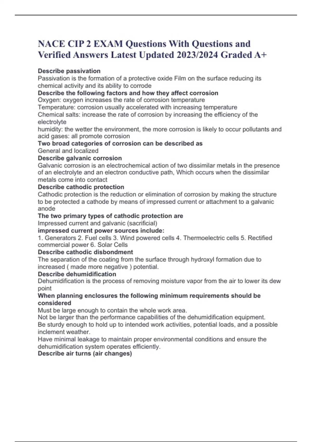 NACE CIP 2 EXAM Questions With Questions and Verified Answers Latest Updated 2023/2024 Graded A+ Describe passivation Passivation is the formation of a protective oxide Film on the surface reducing its chemical activity and its ability to corrode Describe the following factors and how they affect corrosion Oxygen: oxygen increases the rate of corrosion temperature Temperature: corrosion usually accelerated with increasing temperature Chemical salts: increase the rate of corrosion by increasing the efficiency of the electrolyte humidity: the wetter the environment, the more corrosion is likely to occur pollutants and acid gases: all promote corrosion Two broad categories of corrosion can be described as General and localized Describe galvanic corrosion Galvanic corrosion is an electrochemical action of two dissimilar metals in the presence of an electrolyte and an electron conductive path, Which occurs when the dissimilar metals come into contact Describe cathodic protection Cathodic protection is the reduction or elimination of corrosion by making the structure to be protected a cathode by means of impressed current or attachment to a galvanic anode The two primary types of cathodic protection are Impressed current and galvanic (sacrificial) impressed current power sources include: 1. Generators 2. Fuel cells 3. Wind powered cells 4. Thermoelectric cells 5. Rectified commercial power 6. Solar Cells Describe cathodic disbondment The separation of the coating from the surface through hydroxyl formation due to increased ( made mor