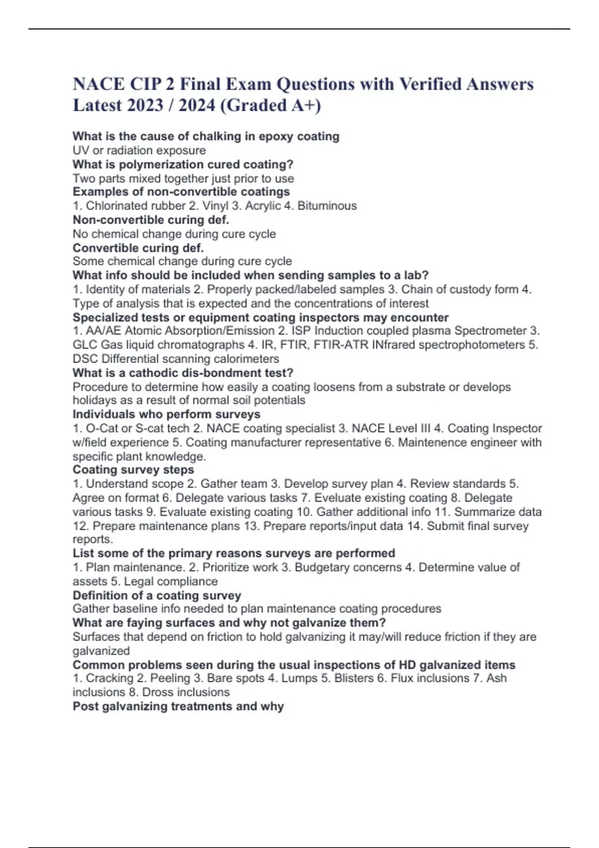 NACE CIP 2 Final Exam Questions with Verified Answers Latest 2023 / 2024 (Graded A+) What is the cause of chalking in epoxy coating UV or radiation exposure What is polymerization cured coating? Two parts mixed together just prior to use Examples of non-convertible coatings 1. Chlorinated rubber 2. Vinyl 3. Acrylic 4. Bituminous Non-convertible curing def. No chemical change during cure cycle Convertible curing def. Some chemical change during cure cycle What info should be included when sending samples to a lab? 1. Identity of materials 2. Properly packed/labeled samples 3. Chain of custody form 4. Type of analysis that is expected and the concentrations of interest Specialized tests or equipment coating inspectors may encounter 1. AA/AE Atomic Absorption/Emission 2. ISP Induction coupled plasma Spectrometer 3. GLC Gas liquid chromatographs 4. IR, FTIR, FTIR-ATR INfrared spectrophotometers 5. DSC Differential scanning calorimeters What is a cathodic dis-bondment test? Procedure to determine how easily a coating loosens from a substrate or develops holidays as a result of normal soil potentials Individuals who perform surveys