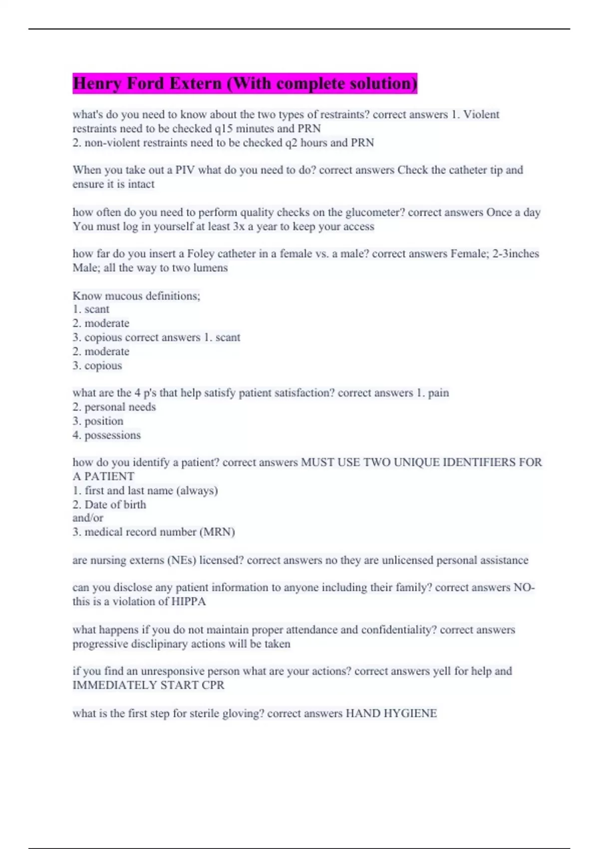 what's do you need to know about the two types of restraints? correct answers 1. Violent restraints need to be checked q15 minutes and PRN 2. non-violent restraints need to be checked q2 hours and PRN When you take out a PIV what do you need to do? correct answers Check the catheter tip and ensure it is intact how often do you need to perform quality checks on the glucometer? correct answers Once a day You must log in yourself at least 3x a year to keep your access how far do you insert a Foley catheter in a female vs. a male? correct answers Female; 2-3inches Male; all the way to two lumens Know mucous definitions; 1. scant 2. moderate 3. copious correct answers 1. scant 2. moderate 3. copious what are the 4 p's that help satisfy patient satisfaction? correct answers 1. pain 2. personal needs 3. position 4. possessions how do you identify a patient? correct answers MUST USE TWO UNIQUE IDENTIFIERS FOR A PATIENT 1. first and last name (always) 2. Date of birth and/or 3. medical record number (MRN) are nursing externs (NEs) licensed? correct answers no they are unlicensed personal assistance can you disclose any patient information to anyone including their family? correct answers NO- this is a violation of HIPPA what happens if you do not maintain proper attendance and confidentiality? correct answers progressive disclipinary actions will be taken if you find an unresponsive person what are your actions? correct answers yell for help and IMMEDIATELY START CPR what is the first step for sterile gloving? correct answers HAND HYGIENE