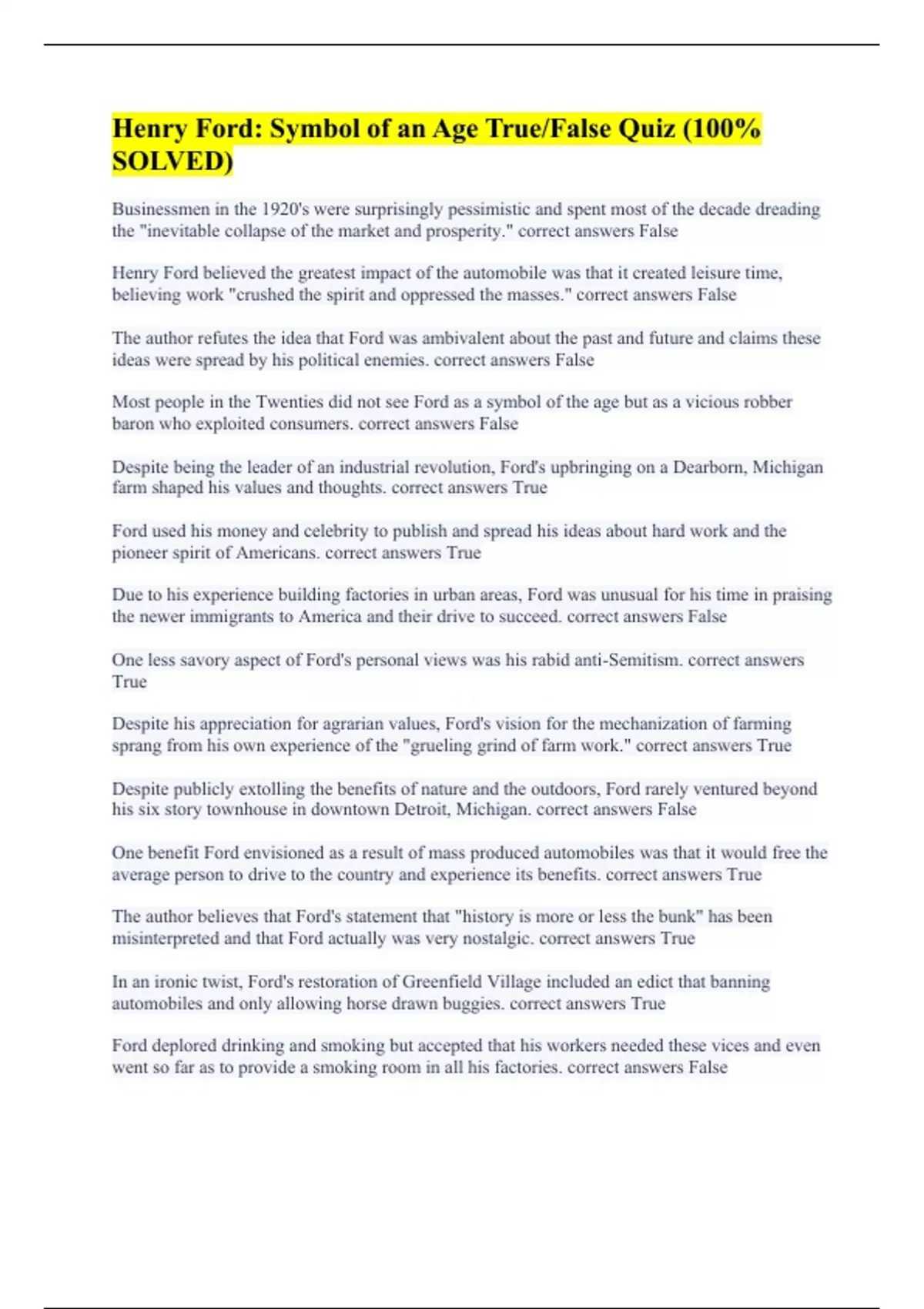 Henry Ford: Symbol of an Age True/False Quiz (100% SOLVED)