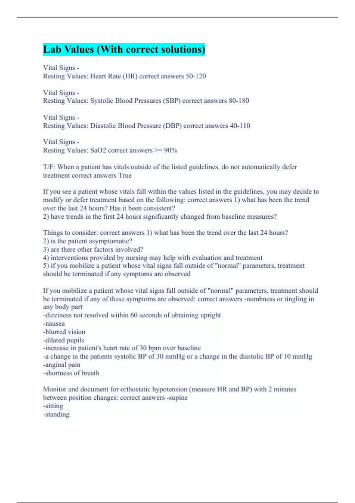 Vital Signs - Resting Values: Heart Rate (HR) correct answers 50-120 Vital Signs - Resting Values: Systolic Blood Pressures (SBP) correct answers 80-180 Vital Signs - Resting Values: Diastolic Blood Pressure (DBP) correct answers 40-110 Vital Signs - Resting Values: SaO2 correct answers >= 90% T/F: When a patient has vitals outside of the listed guidelines, do not automatically defer treatment correct answers True If you see a patient whose vitals fall within the values listed in the guidelines, you may decide to modify or defer treatment based on the following: correct answers 1) what has been the trend over the last 24 hours? Has it been consistent? 2) have trends in the first 24 hours significantly changed from baseline measures? Things to consider: correct answers 1) what has been the trend over the last 24 hours? 2) is the patient asymptomatic? 3) are there other factors involved? 4) interventions provided by nursing may help with evaluation and treatment 5) if you mobilize a patient whose vital signs fall outside of "normal" parameters, treatment should be terminated if any symptoms are observed If you mobilize a patient whose vital signs fall outside of "normal" parameters, treatment should be terminated if any of these symptoms are observed: correct answers -numbness or tingling in any body part -dizziness not resolved within 60 seconds of obtaining upright -nausea -blurred vision -dilated pupils -increase in patient's heart rate of 30 bpm over baseline -a change in the patients systolic BP of 30 mmHg or a change in the diastolic BP of 10 mmHg -anginal pain -shortness of breath Monitor and document for orthostatic hypotension (measure HR and BP) with 2 minutes between position changes: correct answers -supine -sitting -standing