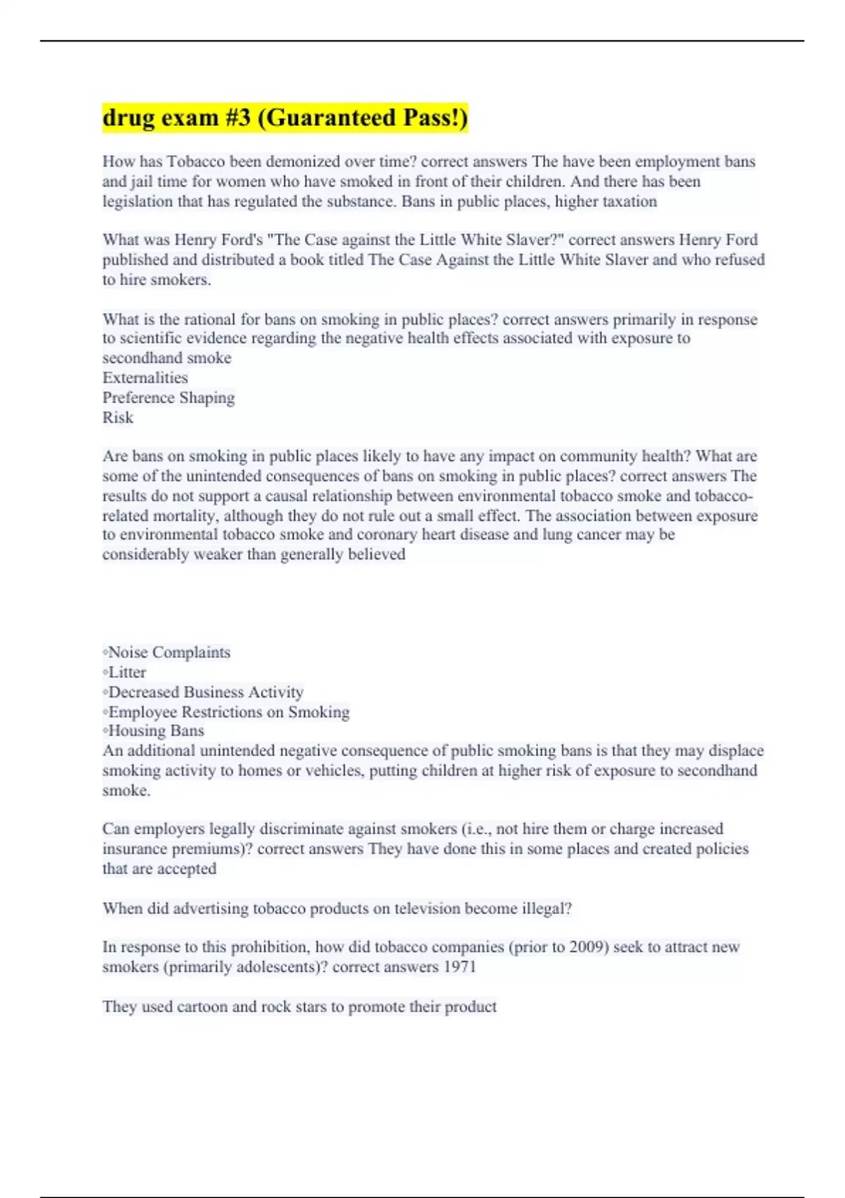 How has Tobacco been demonized over time? correct answers The have been employment bans and jail time for women who have smoked in front of their children. And there has been legislation that has regulated the substance. Bans in public places, higher taxation What was Henry Ford's "The Case against the Little White Slaver?" correct answers Henry Ford published and distributed a book titled The Case Against the Little White Slaver and who refused to hire smokers. What is the rational for bans on smoking in public places? correct answers primarily in response to scientific evidence regarding the negative health effects associated with exposure to secondhand smoke Externalities Preference Shaping Risk Are bans on smoking in public places likely to have any impact on community health? What are some of the unintended consequences of bans on smoking in public places? correct answers The results do not support a causal relationship between environmental tobacco smoke and tobacco-related mortality, although they do not rule out a small effect. The association between exposure to environmental tobacco smoke and coronary heart disease and lung cancer may be considerably weaker than generally believed ◦Noise Complaints ◦Litter ◦Decreased Business Activity ◦Employee Restrictions on Smoking ◦Housing Bans An additional unintended negative consequence of public smoking bans is that they may displace smoking activity to homes or vehicles, putting children at higher risk of exposure to secondhand smoke. Can employers legally discriminate against smokers (i.e., not hire them or charge increased insurance premiums)? correct answers They have done this in some places and created policies that are accepted When did advertising tobacco products on television become illegal? In response to this prohibition, how did tobacco companies (prior to 2009) seek to attract new smokers (primarily adolescents)? correct answers 1971 They used cartoon and rock stars to promote their product