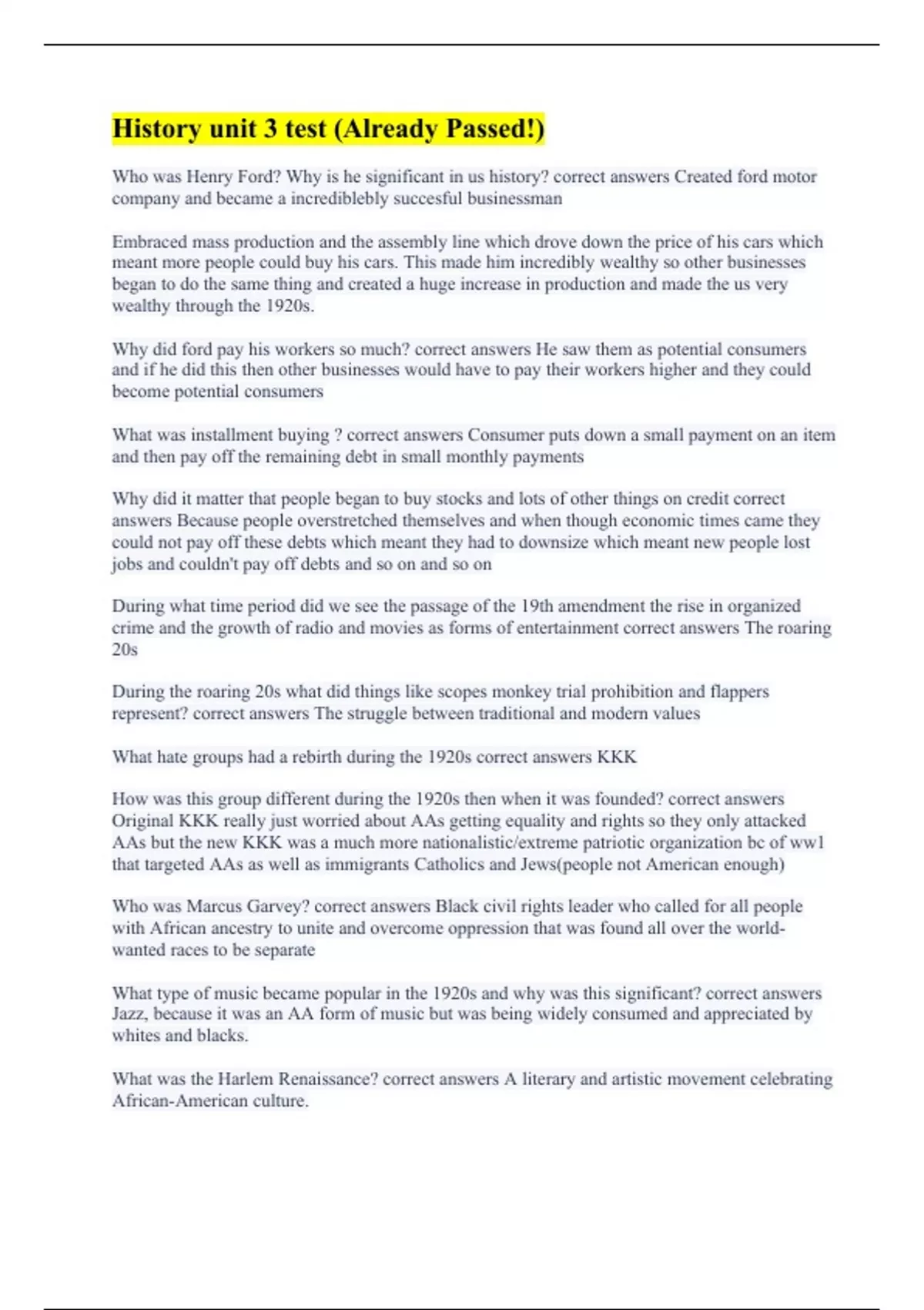 Who was Henry Ford? Why is he significant in us history? correct answers Created ford motor company and became a incrediblebly succesful businessman Embraced mass production and the assembly line which drove down the price of his cars which meant more people could buy his cars. This made him incredibly wealthy so other businesses began to do the same thing and created a huge increase in production and made the us very wealthy through the 1920s. Why did ford pay his workers so much? correct answers He saw them as potential consumers and if he did this then other businesses would have to pay their workers higher and they could become potential consumers What was installment buying ? correct answers Consumer puts down a small payment on an item and then pay off the remaining debt in small monthly payments Why did it matter that people began to buy stocks and lots of other things on credit correct answers Because people overstretched themselves and when though economic times came they could not pay off these debts which meant they had to downsize which meant new people lost jobs and couldn't pay off debts and so on and so on During what time period did we see the passage of the 19th amendment the rise in organized crime and the growth of radio and movies as forms of entertainment correct answers The roaring 20s During the roaring 20s what did things like scopes monkey trial prohibition and flappers represent? correct answers The struggle between traditional and modern values What hate groups had a rebirth during the 1920s correct answers KKK How was this group different during the 1920s then when it was founded? correct answers Original KKK really just worried about AAs getting equality and rights so they only attacked AAs but the new KKK was a much more nationalistic/extreme patriotic organization bc of ww1 that targeted AAs as well as immigrants Catholics and Jews(people not American enough) Who was Marcus Garvey? correct answers Black civil rights leader who called for all people with African ancestry to unite and overcome oppression that was found all over the world- wanted races to be separate What type of music became popular in the 1920s and why was this significant? correct answers Jazz, because it was an AA form of music but was being widely consumed and appreciated by whites and blacks. What was the Harlem Renaissance? correct answers A literary and artistic movement celebrating African-American culture.