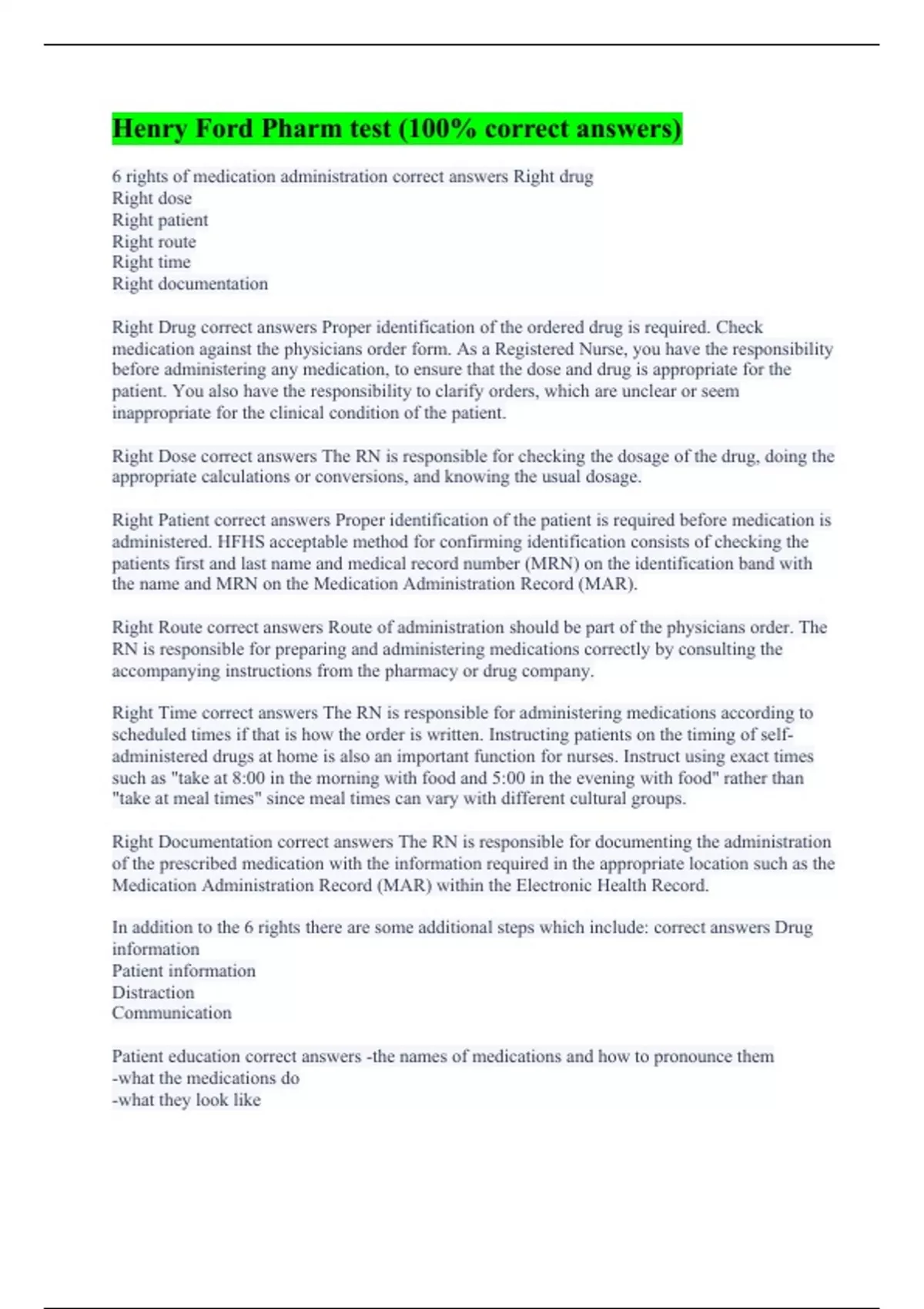 6 rights of medication administration correct answers Right drug Right dose Right patient Right route Right time Right documentation Right Drug correct answers Proper identification of the ordered drug is required. Check medication against the physicians order form. As a Registered Nurse, you have the responsibility before administering any medication, to ensure that the dose and drug is appropriate for the patient. You also have the responsibility to clarify orders, which are unclear or seem inappropriate for the clinical condition of the patient. Right Dose correct answers The RN is responsible for checking the dosage of the drug, doing the appropriate calculations or conversions, and knowing the usual dosage. Right Patient correct answers Proper identification of the patient is required before medication is administered. HFHS acceptable method for confirming identification consists of checking the patients first and last name and medical record number (MRN) on the identification band with the name and MRN on the Medication Administration Record (MAR). Right Route correct answers Route of administration should be part of the physicians order. The RN is responsible for preparing and administering medications correctly by consulting the accompanying instructions from the pharmacy or drug company. Right Time correct answers The RN is responsible for administering medications according to scheduled times if that is how the order is written. Instructing patients on the timing of self-administered drugs at home is also an important function for nurses. Instruct using exact times such as "take at 8:00 in the morning with food and 5:00 in the evening with food" rather than "take at meal times" since meal times can vary with different cultural groups. Right Documentation correct answers The RN is responsible for documenting the administration of the prescribed medication with the information required in the appropriate location such as the Medication Administration Record (MAR) within the Electronic Health Record. In addition to the 6 rights there are some additional steps which include: correct answers Drug information Patient information Distraction Communication Patient education correct answers -the names of medications and how to pronounce them -what the medications do -what they look like