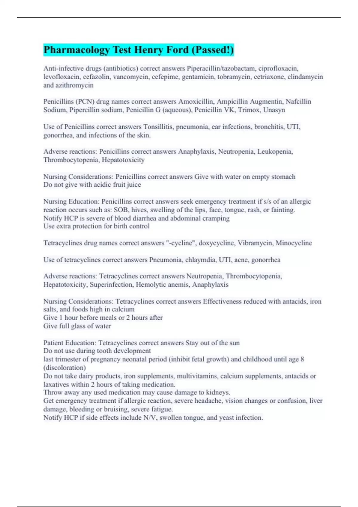 Anti-infective drugs (antibiotics) correct answers Piperacillin/tazobactam, ciprofloxacin, levofloxacin, cefazolin, vancomycin, cefepime, gentamicin, tobramycin, cetriaxone, clindamycin and azithromycin Penicillins (PCN) drug names correct answers Amoxicillin, Ampicillin Augmentin, Nafcillin Sodium, Pipercillin sodium, Penicillin G (aqueous), Penicillin VK, Trimox, Unasyn Use of Penicillins correct answers Tonsillitis, pneumonia, ear infections, bronchitis, UTI, gonorrhea, and infections of the skin. Adverse reactions: Penicillins correct answers Anaphylaxis, Neutropenia, Leukopenia, Thrombocytopenia, Hepatotoxicity Nursing Considerations: Penicillins correct answers Give with water on empty stomach Do not give with acidic fruit juice Nursing Education: Penicillins correct answers seek emergency treatment if s/s of an allergic reaction occurs such as: SOB, hives, swelling of the lips, face, tongue, rash, or fainting. Notify HCP is severe of blood diarrhea and abdominal cramping Use extra protection for birth control Tetracyclines drug names correct answers "-cycline", doxycycline, Vibramycin, Minocycline Use of tetracyclines correct answers Pneumonia, chlaymdia, UTI, acne, gonorrhea Adverse reactions: Tetracyclines correct answers Neutropenia, Thrombocytopenia, Hepatotoxicity, Superinfection, Hemolytic anemis, Anaphylaxis Nursing Considerations: Tetracyclines correct answers Effectiveness reduced with antacids, iron salts, and foods high in calcium Give 1 hour before meals or 2 hours after Give full glass of water Patient Education: Tetracyclines correct answers Stay out of the sun Do not use during tooth development last trimester of pregnancy neonatal period (inhibit fetal growth) and childhood until age 8 (discoloration) Do not take dairy products, iron supplements, multivitamins, calcium supplements, antacids or laxatives within 2 hours of taking medication. Throw away any used medication may cause damage to kidneys. Get emergency treatment if allergic reaction, severe headache, vision changes or confusion, liver damage, bleeding or bruising, severe fatigue. Notify HCP if side effects include N/V, swollen tongue, and yeast infection.