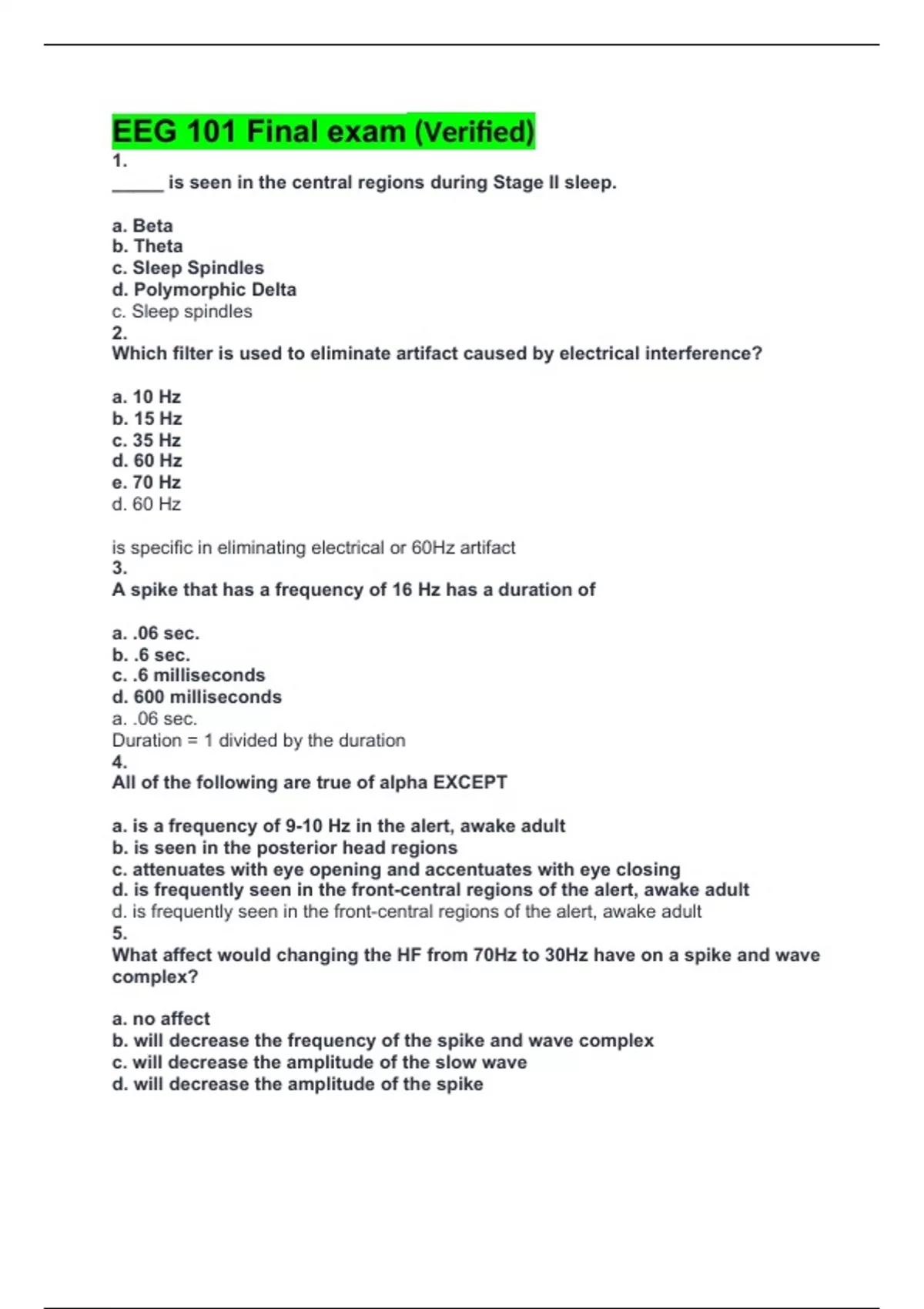 EEG 101 Final exam (Verified) 1. _____ is seen in the central regions during Stage II sleep. a. Beta b. Theta c. Sleep Spindles d. Polymorphic Delta c. Sleep spindles 2. Which filter is used to eliminate artifact caused by electrical interference? a. 10 Hz b. 15 Hz c. 35 Hz d. 60 Hz e. 70 Hz d. 60 Hz is specific in eliminating electrical or 60Hz artifact 3. A spike that has a frequency of 16 Hz has a duration of a. .06 sec. b. .6 sec. c. .6 milliseconds d. 600 milliseconds a. .06 sec. Duration = 1 divided by the duration 4. All of the following are true of alpha EXCEPT a. is a frequency of 9-10 Hz in the alert, awake adult b. is seen in the posterior head regions c. attenuates with eye opening and accentuates with eye closing d. is frequently seen in the front-central regions of the alert, awake adult d. is frequently seen in the front-central regions of the alert, awake adult 5. What affect would changing the HF from 70Hz to 30Hz have on a spike and wave complex? a. no affect b. will decrease the frequency of the spike and wave complex c. will decrease the amplitude of the slow wave d. will decrease the amplitude of the spike d. will decrease the amplitude of the spike HF affects fast wave. Spikes are fast and change in the HF will decrease the amplitude of the spike. 6. Beta activity is a. seen in the frontal regions of the alert, awake, relaxed adult b. is frequently seen in the occipital regions during drowsiness c. accentuates with eye opening d. is always indicative of barbibuate use a. seen in the frontal regions of the alert, awake, relaxed adult 7. _____ is 1 divided by the duration of the wave in seconds. a. duration b. frequency c. voltage d. amplitude b. frequency 8. What is the basic functional and structural unit of the nervous system? a. neuron b. myelin sheath c. electron d. axon a neuron 9. _____ is seen in drowsiness at frequency of 4-7hz a. alpha b. beta c. theta d. delta c. theta 10. A slow wave having three phases +,-,+ or -,+,- and that is seen in the variety of metabolic disorders is a. triphaisc b. complex c. transient d. sharp a. triphaisc 11. A slow wave has a duration of a. > 200ms b. 70-200ms c. <70ms d 20ms >200ms 12. While recording an EEG your patient has a generalized Toni-Clonic sz. What should you do ? a. Call a code b. place a tongue depressor in the patient mouth c. turn the EEG machine off d. roll the patient on their side, insure an open airway and loosen any tight clothing d. roll the patient on their side, insure an open airway and loosen any tight clothing 13. What in a digital recording allows for changing the montage at a time after the pt. leaves the lab? a. reformatting b. analog to digital convert c. common mode rejection d. Nyquist theorem a. reformatting 14. ________ is seen the occipital region of an alert, relaxed adult. a. Alpha b. Beta c. Theta d. Delta A. Alpha 15. The ACNS quidelines recommend a minimum of ______ channels of simultaneous recording for routine EEG's A. 16 B. 19 C. 21 D. 32 A. 16 16. 1Hz wave has a duration of A. 100 ms B. 200ms C. 400 ms D. 1000ms D. 1000 ms 17. If input 1 is relatively more negative then input 2 the pen will A. Deflect up B. Deflect down C. Will remain flat D. Go up and down at the same time A. Deflect up 18. If the duration of the wave is 2sec. The frequency would be A. 1Hz B. 2Hz C. 5Hz D. 10Hz C. 5Hz 19. If a patient tongue deviates toward the right upon neurological examination, what dose this suggest? A. Contralateral weakness of the facial muscles B. Bilateral hypoglossal nerve lesion C. Right sided hypoglossal nerve lesion D. Right sided trigeminal nerve lesion C. Right sided hypoglossal nerve lesion 20. _______ is expressed in cycles per sec. (CPS) or (HZ) A. Frequency B. Voltage C. Sensitivity D. Duration A. Frequency 21. A sharp wave has a duration of