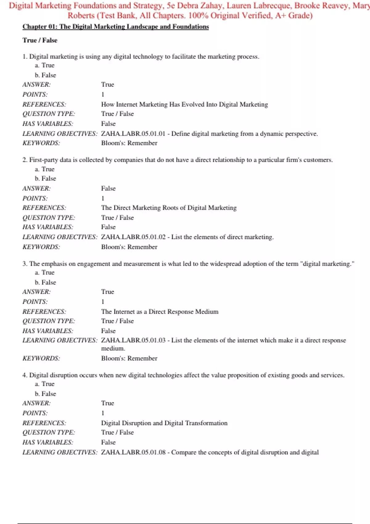 Test Bank for Digital Marketing Foundations and Strategy 5th Edition By Debra Zahay, Lauren Labrecque, Brooke Reavey, Mary Roberts (All Chapters, 100% original verified, A+ Grade) Test Bank for Digital Marketing Foundations and Strategy 5e By Debra Zahay, Lauren Labrecque, Brooke Reavey, Mary Roberts (All Chapters, 100% original verified, A+ Grade)