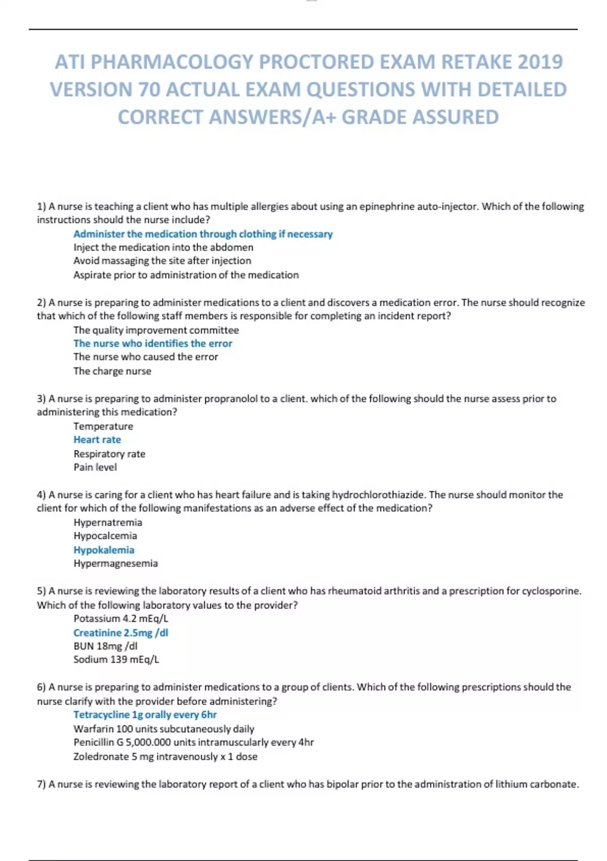 ATI PHARMACOLOGY PROCTORED EXAM RETAKE 2019 VERSION 70 ACTUAL EXAM QUESTIONS WITH DETAILED CORRECT ANSWERS/A+ GRADE ASSURED