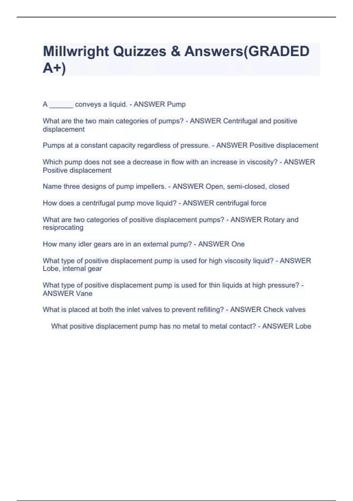 A ______ conveys a liquid. - ANSWER Pump What are the two main categories of pumps? - ANSWER Centrifugal and positive displacement Pumps at a constant capacity regardless of pressure. - ANSWER Positive displacement Which pump does not see a decrease in flow with an increase in viscosity? - ANSWER Positive displacement Name three designs of pump impellers. - ANSWER Open, semi-closed, closed What are the two main categories of pumps? - ANSWER Centrifugal and positive displacement