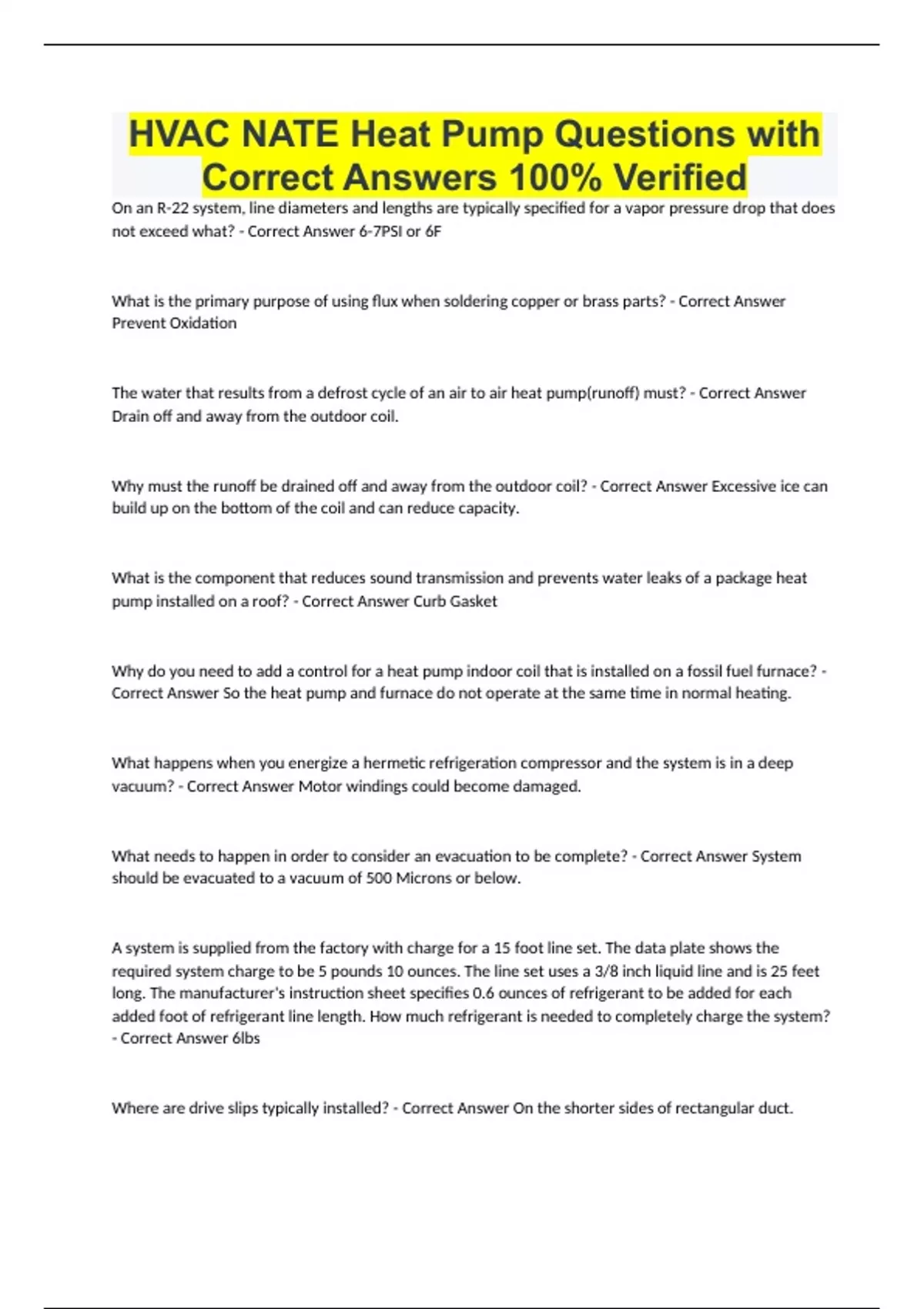 HVAC NATE Heat Pump Questions with Correct Answers 100% Verified On an R-22 system, line diameters and lengths are typically specified for a vapor pressure drop that does not exceed what? - Correct Answer 6-7PSI or 6F What is the primary purpose of using flux when soldering copper or brass parts? - Correct Answer Prevent Oxidation The water that results from a defrost cycle of an air to air heat pump(runoff) must? - Correct Answer Drain off and away from the outdoor coil. Why must the runoff be drained off and away from the outdoor coil? - Correct Answer Excessive ice can build up on the bottom of the coil and can reduce capacity. What is the component that reduces sound transmission and prevents water leaks of a package heat pump installed on a roof? - Correct Answer Curb Gasket Why do you need to add a control for a heat pump indoor coil that is installed on a fossil fuel furnace? - Correct Answer So the heat pump and furnace do not operate at the same time in normal heating. What happens when you energize a hermetic refrigeration compressor and the system is in a deep vacuum? - Correct Answer Motor windings could become damaged. What needs to happen in order to consider an evacuation to be complete? - Correct Answer System should be evacuated to a vacuum of 500 Microns or below. A system is supplied from the factory with charge for a 15 foot line set. The data plate shows the required system charge to be 5 pounds 10 ounces. The line set uses a 3/8 inch liquid line and is 25 feet long. The manufacturer's instruction sheet specifies 0.6 ounces of refrigerant to be added for each added foot of refrigerant line length. How much refrigerant is needed to completely charge the system? - Correct Answer 6lbs Where are drive slips typically installed? - Correct Answer On the shorter sides of rectangular duct.