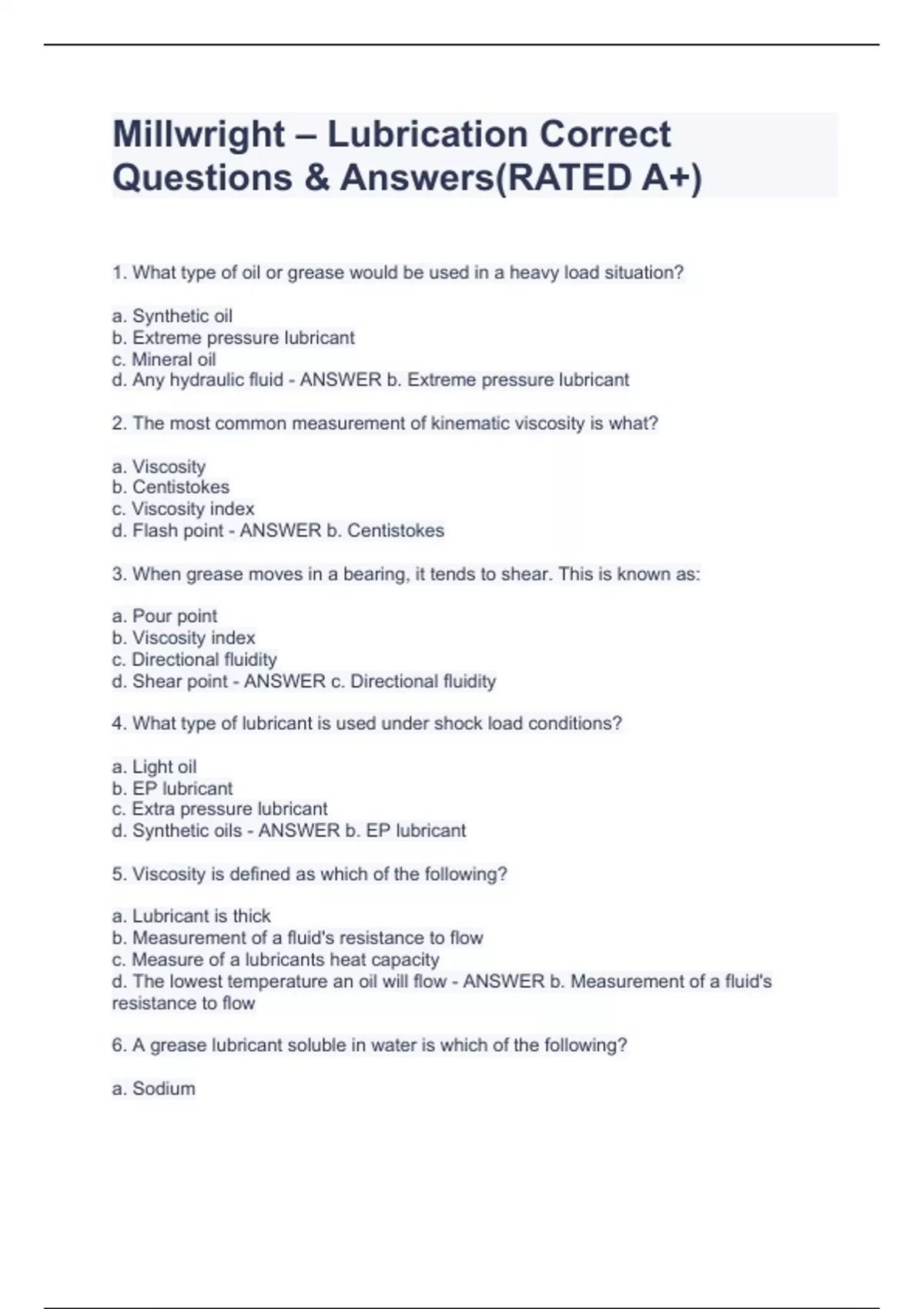1. What type of oil or grease would be used in a heavy load situation? a. Synthetic oil b. Extreme pressure lubricant c. Mineral oil d. Any hydraulic fluid - ANSWER b. Extreme pressure lubricant 2. The most common measurement of kinematic viscosity is what? a. Viscosity b. Centistokes c. Viscosity index d. Flash point - ANSWER b. Centistokes 3. When grease moves in a bearing, it tends to shear. This is known as: a. Pour point b. Viscosity index c. Directional fluidity d. Shear point - ANSWER c. Directional fluidity 4. What type of lubricant is used under shock load conditions? a. Light oil b. EP lubricant c. Extra pressure lubricant d. Synthetic oils - ANSWER b. EP lubricant 5. Viscosity is defined as which of the following? a. Lubricant is thick b. Measurement of a fluid's resistance to flow c. Measure of a lubricants heat capacity d. The lowest temperature an oil will flow - ANSWER b. Measurement of a fluid's resistance to flow 6. A grease lubricant soluble in water is which of the following? a. Sodium