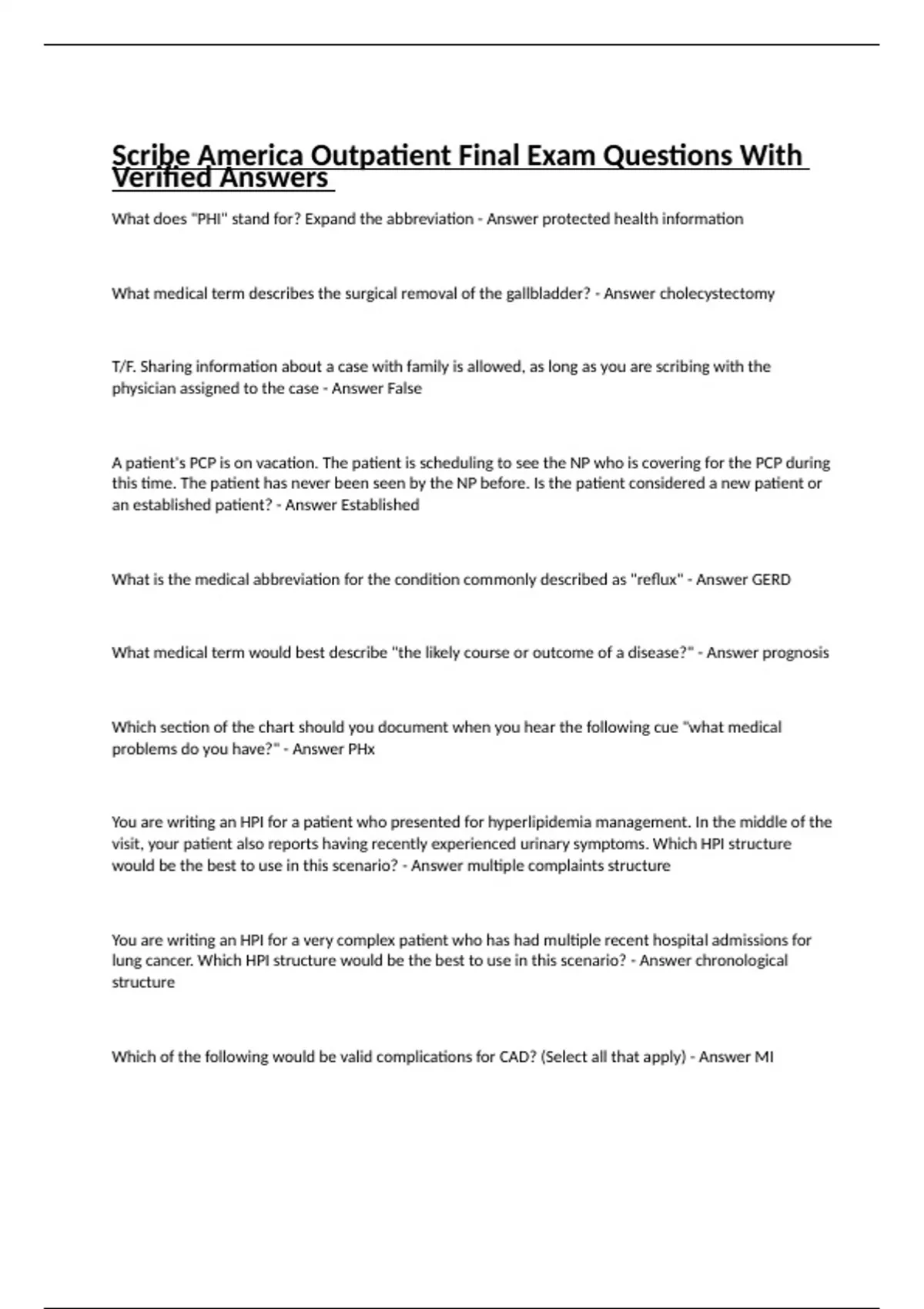 Scribe America Outpatient Final Exam Questions With Verified Answers