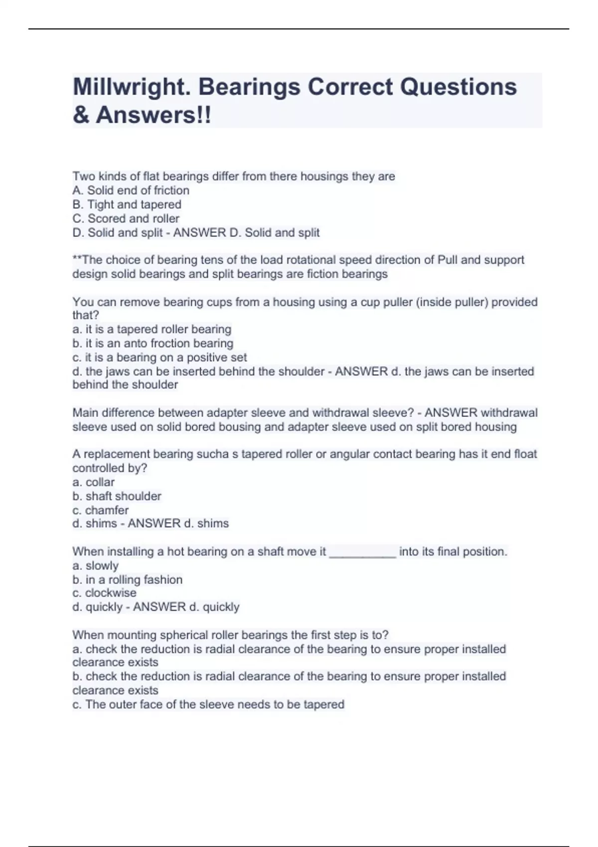 Millwright. Bearings Correct Questions & Answers!!