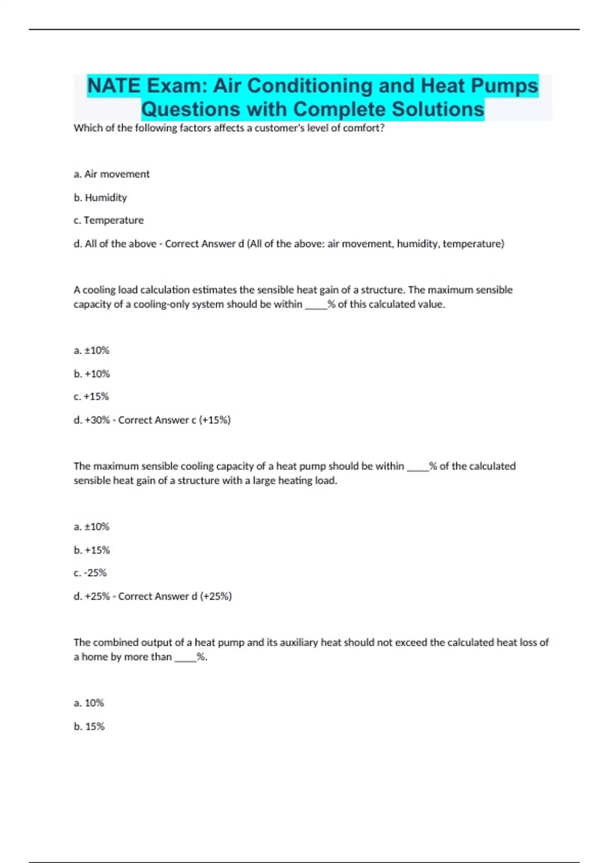 NATE Exam: Air Conditioning and Heat Pumps Questions with Complete Solutions Which of the following factors affects a customer's level of comfort? a. Air movement b. Humidity c. Temperature d. All of the above - Correct Answer d (All of the above: air movement, humidity, temperature) A cooling load calculation estimates the sensible heat gain of a structure. The maximum sensible capacity of a cooling-only system should be within ____% of this calculated value. a. ±10% b. +10% c. +15% d. +30% - Correct Answer c (+15%) The maximum sensible cooling capacity of a heat pump should be within ____% of the calculated sensible heat gain of a structure with a large heating load. a. ±10% b. +15% c. -25% d. +25% - Correct Answer d (+25%) The combined output of a heat pump and its auxiliary heat should not exceed the calculated heat loss of a home by more than ____%. a. 10% b. 15%