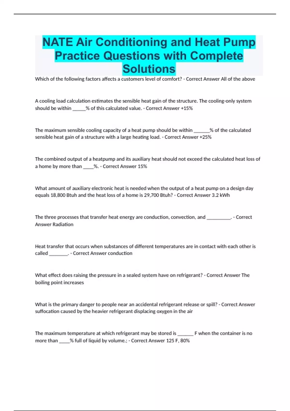 NATE Air Conditioning and Heat Pump Practice Questions with Complete Solutions Which of the following factors affects a customers level of comfort? - Correct Answer All of the above A cooling load calculation estimates the sensible heat gain of the structure. The cooling-only system should be within _____% of this calculated value. - Correct Answer +15% The maximum sensible cooling capacity of a heat pump should be within ______% of the calculated sensible heat gain of a structure with a large heating load. - Correct Answer +25% The combined output of a heatpump and its auxiliary heat should not exceed the calculated heat loss of a home by more than ____%. - Correct Answer 15% What amount of auxiliary electronic heat is needed when the output of a heat pump on a design day equals 18,800 Btuh and the heat loss of a home is 29,700 Btuh? - Correct Answer 3.2 kWh The three processes that transfer heat energy are conduction, convection, and _________. - Correct Answer Radiation Heat transfer that occurs when substances of different temperatures are in contact with each other is called _______. - Correct Answer conduction What effect does raising the pressure in a sealed system have on refrigerant? - Correct Answer The boiling point increases What is the primary danger to people near an accidental refrigerant release or spill? - Correct Answer suffocation caused by the heavier refrigerant displacing oxygen in the air The maximum temperature at which refrigerant may be stored is ______ F when the container is no more than ____% full of liquid by volume.; - Correct Answer 125 F, 80%
