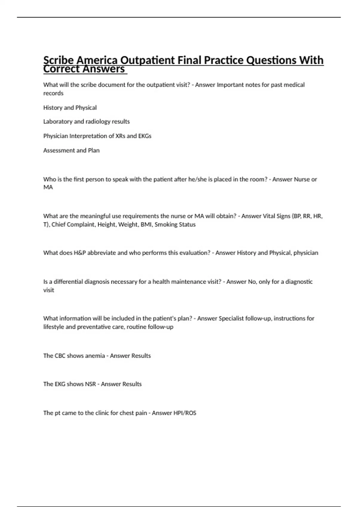 Scribe America Outpatient Final Practice Questions With Correct Answers